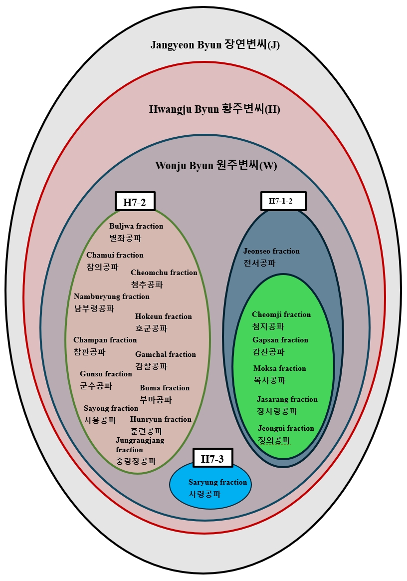 오른쪽 그림은 변안열의 후손은 H7-2, 변안서의 후손은 H7-3, 변숙의 후손은 H7-1-2로 표시되어 있다. H7-2는 황주변씨 7세대, 변량의 둘째 아들을 의미한다.