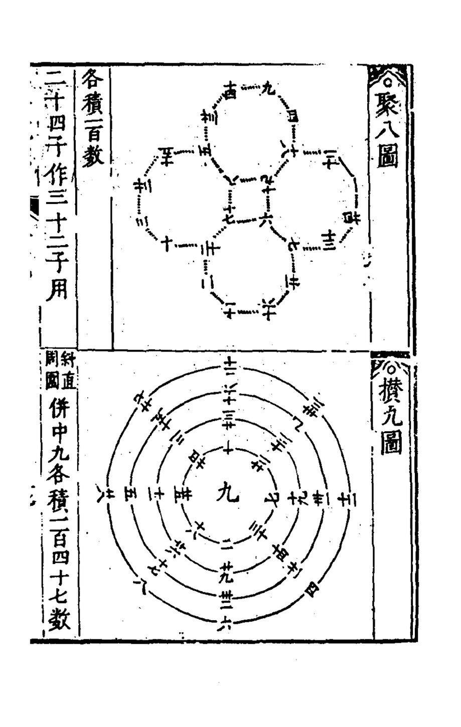 양휘는 사각형 모양의 동심원 마법진인 팔진도(八陣圖)와 연환도(連環圖)를 제시했다. 팔진도는 8개의 원으로, 연환도는 9개의 원으로 구성되어 있으며, 각 원에는 여러 숫자가 특정한 규칙에 따라 배열되어 합이 일정하게 나오는 특징을 가진다.2. 2. 1. 팔진도(八陣圖)
