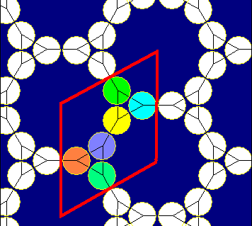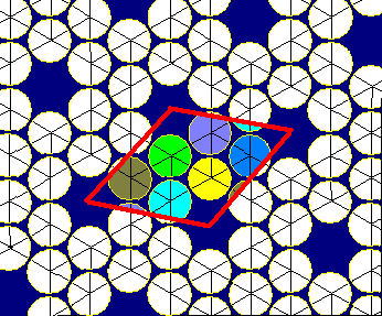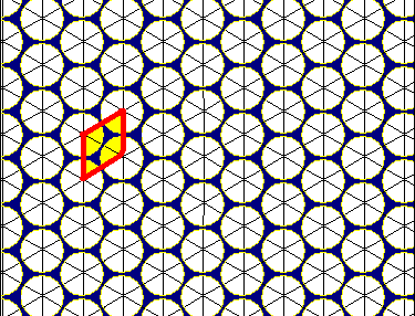 1773년, 조제프루이 라그랑주는 원의 중심이 육각형 격자(벌집 모양처럼 엇갈린 배열)를 이루는 육각형 채우기가 가장 밀도가 높은 격자 배열임을 증명했다.[1] 이 배열에서는 각 원이 주변의 다른 여섯 개 원과 접하게 되며, 밀도(전체 면적에서 원이 차지하는 비율)는 다음과 같이 계산된다.