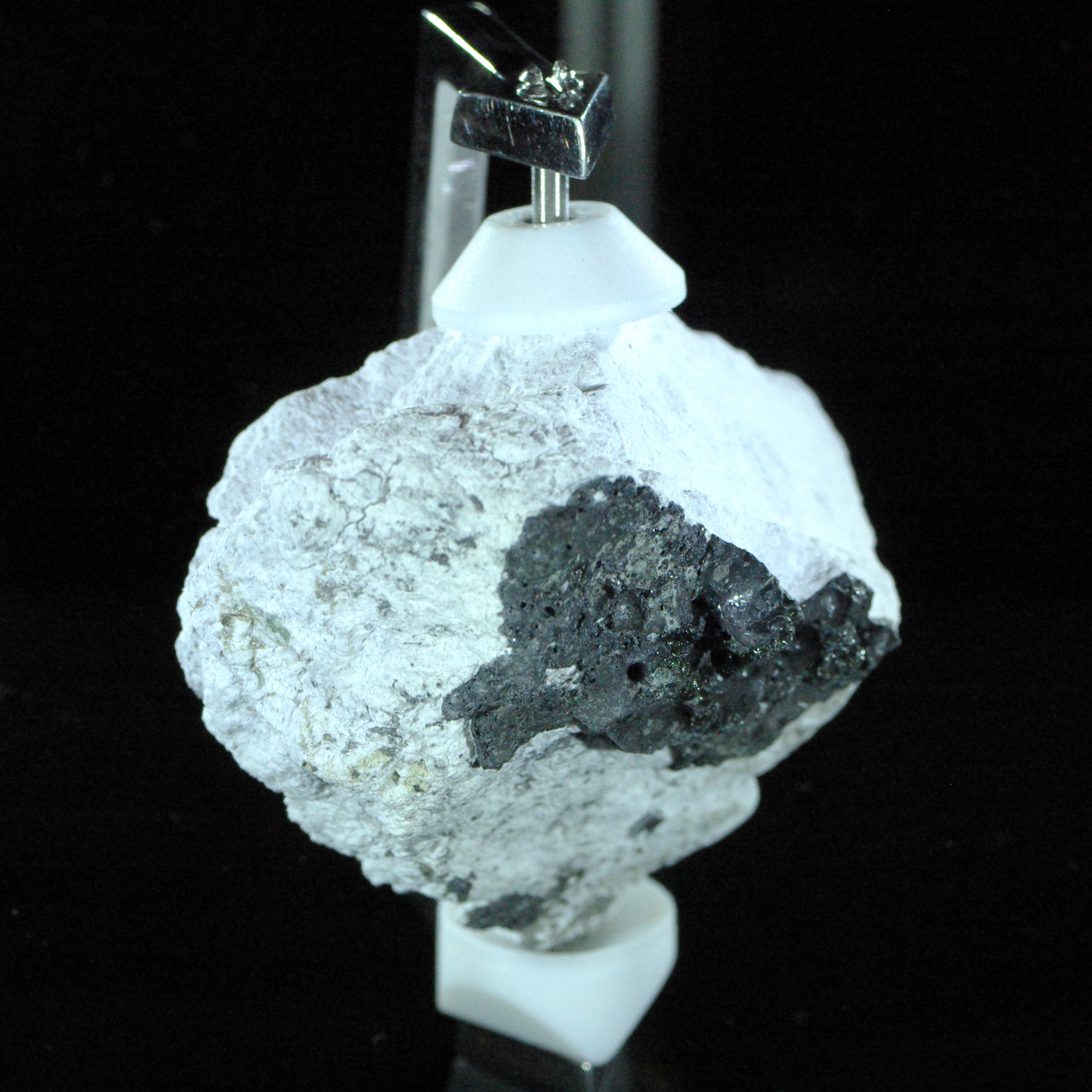 월석에는 검은 가루가 붙어 있는데, 이 가루는 초자성(硝子性)을 띤 아주 작은 구슬 조각의 집합이다. 달에서 채집한 가루의 거의 절반은 초자성이었으며, 이는 0.2mm 이하의 구(球)·타원·아령형과 다(茶)·황(黃)·녹(綠)색의 색깔, 투명 또는 반투명의 얇은 판상(板狀)을 이룬 다색 등으로 분류할 수 있다. 이 초자분(硝子粉) 외에도 가루 중에는 사장석, 단사휘석, 티탄철광(Titan 鐵鑛) 등의 암석과 광물질도 섞여 있었다.[53]