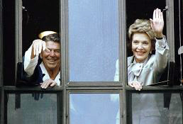 미국 대통령 로널드 레이건과 영부인 낸시 레이건이 1985년 암 수술 후 월터 리드 병원 창문에서 손을 흔드는 모습