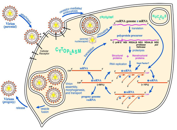 웨스트 나일 바이러스(WNV)는 일본뇌염 항원 혈청형 바이러스의 혈청복합체 중 하나이다.[20] 극저온 전자 현미경으로 밝혀진 바에 따르면, 직경 45~50nm의 비리온(virion)은 비교적 매끄러운 단백질 표면으로 덮여 있다. 이 구조는 뎅기열 바이러스와 유사하며, 둘 다 ''Flaviviridae''과에 속하는 ''Flavivirus'' 속에 속한다. WNV의 유전 물질은 11,000~12,000 뉴클레오타이드 길이의 양성 가닥, 단일 가닥 RNA이다. 이 유전자는 7개의 비구조 단백질과 3개의 구조 단백질을 암호화한다. RNA 가닥은 12-kDa 단백질 블록으로 형성된 뉴클레오캡시드 내에 유지된다. 캡시드는 두 개의 바이러스 막 단백질에 의해 변형된 숙주 유래 생체막 내에 포함되어 있다.[21]웨스트 나일 바이러스는 고온에서 조류에 더 빠르게 복제되고 더 쉽게 확산되는 것으로 나타났다. 이는 기후 변화가 이 질병의 역학에 영향을 미칠 수 있는 여러 가지 방법 중 하나이다.[101]