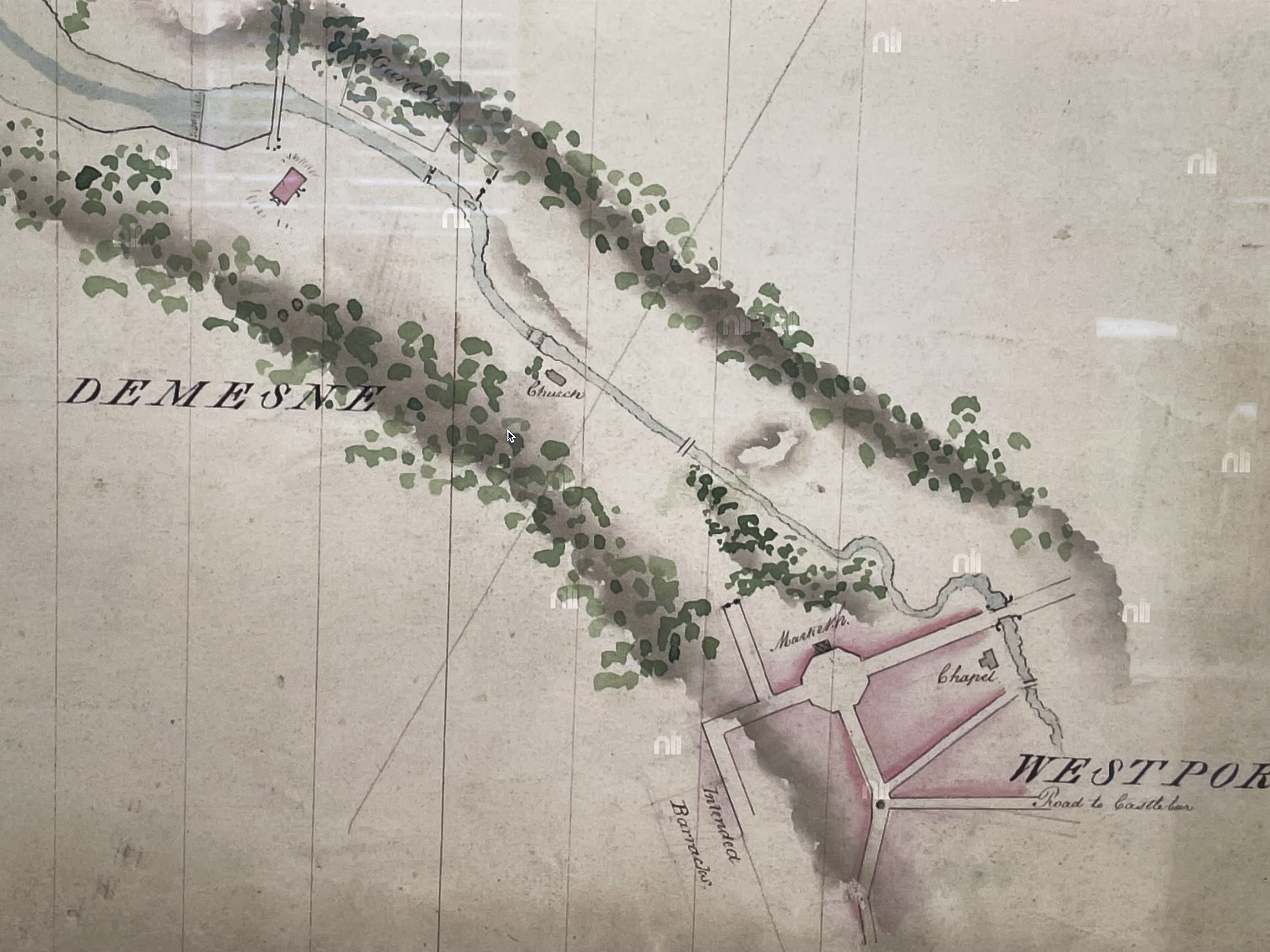 최초의 카하르 나 마르트 마을은 현재 웨스트포트 하우스 정면(동쪽) 잔디밭 부근에 있었으며, 인구는 약 700명이었다.[82] 마을에는 하나의 대로와 강으로 이어지는 골목길이 있었고, 캐로우베그 강 하구에는 작은 항구가 있었다. 1780년, 웨스트포트 하우스의 브라운 가문은 정원으로 가는 길을 만들기 위해 마을을 현재 위치로 옮기고 웨스트포트로 이름을 변경했다.[80]