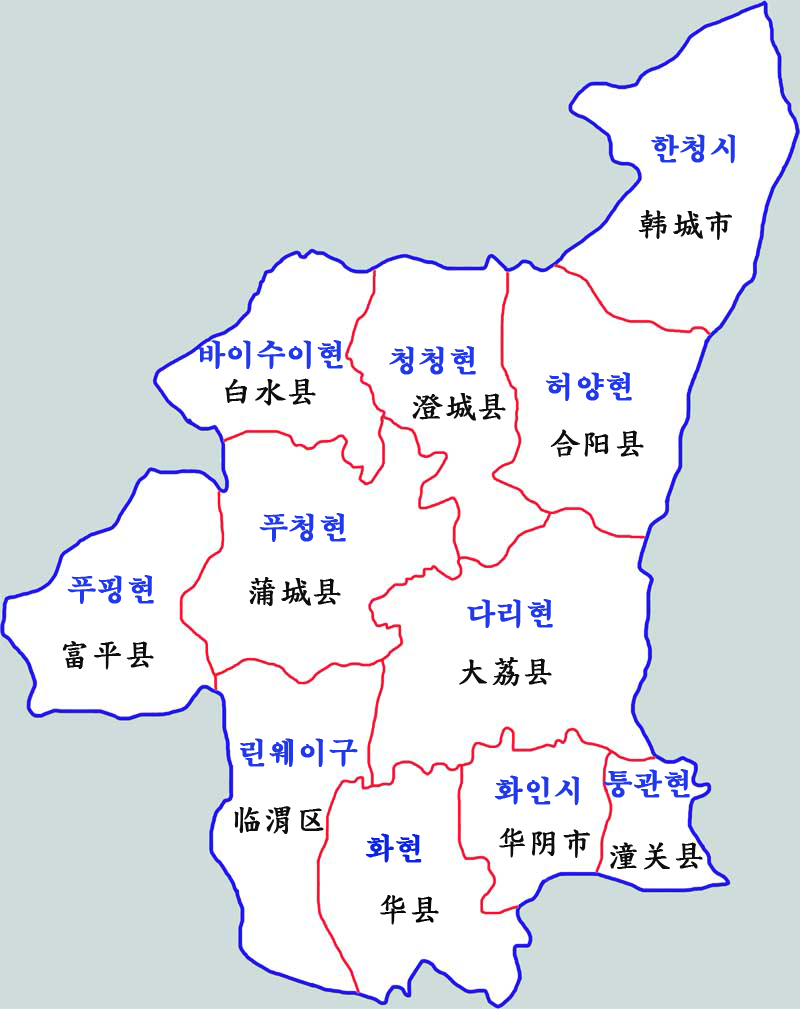 1949년 10월 1일 | 중화인민공화국 산시성 아래 다리 지구 (다리현, 차오이현, 핑민현, 청청현, 허양현, 한청현, 바이수이현, 푸청현)와 웨이난 지구 (웨이난현, 화현, 화인현, 퉁관현, 란톈현, 린퉁현)가 각각 성립되었다. |