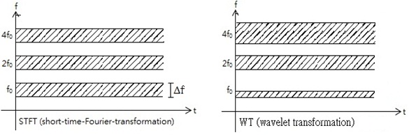푸리에 변환은 시간 정보가 없어 시간-주파수 해석에 부적합하지만, 단시간 푸리에 변환(STFT)은 시간 윈도우 개념을 도입하여 시간 정보를 제공한다. 그러나 STFT는 기저의 상사성이 없어 특이점 감도가 낮다. 웨이블릿 변환은 기저의 상사성을 유지하며 시간-주파수 분석을 수행한다.