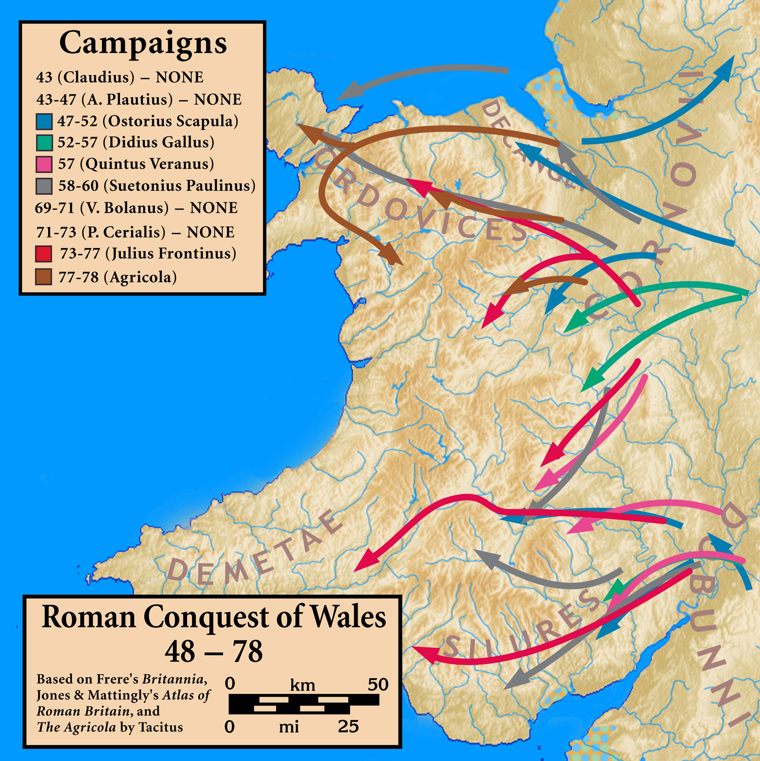 로마 제국의 웨일스 정복은 서기 48년에 시작되어 30년 만인 서기 78년에 완료되었으며, 로마의 지배는 383년까지 300년 이상 지속되었다. 로마의 침략에 맞선 가장 유명한 저항은 카투벨라우니족(오늘날의 에식스) 출신의 카라타쿠스가 이끌었다. 그는 로마군에게 패배한 후, 웨일스로 피신하여 실루레스족(오늘날의 몬머스셔)과 오르도비스족(북부 웨일스)과 함께 로마에 대항하는 전쟁을 계속했다. 그러나 그의 군대는 결국 패배했고, 카라타쿠스는 로마에 넘겨졌다. 로마로 압송된 카라타쿠스는 황제 앞에서 연설하여 깊은 인상을 남겼고, 사면받아 로마에서 평화롭게 살 수 있었다.