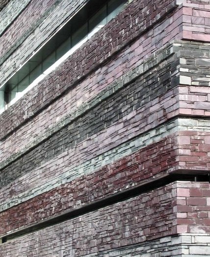 웨일스 밀레니엄 센터의 외부 벽에 있는 유리 정맥은 기존 유리를 독특한 방식으로 사용합니다. 유리 시트를 쌓아 가마에서 융합하여 단단한 블록을 형성합니다. ''—조나단 아담스''[32]