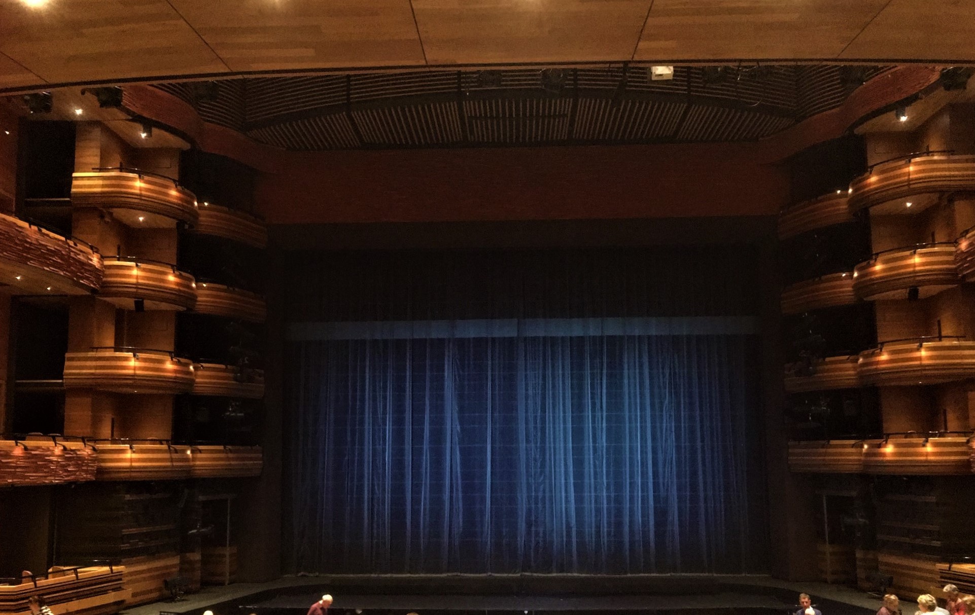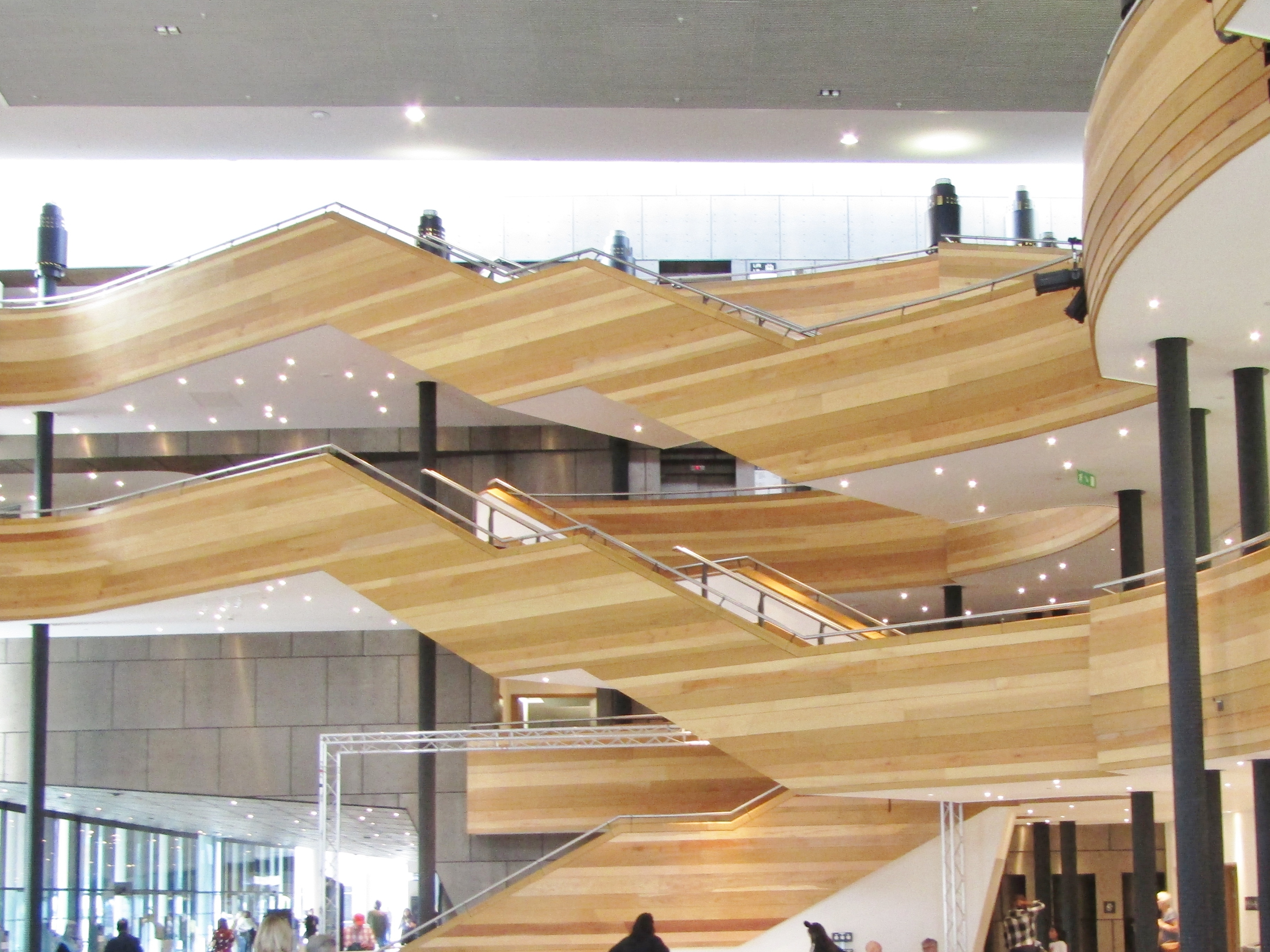 건물 내부와 외부(메인 도널드 고든 극장, 발코니, 건물 뒷면 포함)는 벽을 따라 늘어선 활엽수 목재 띠가 두드러진다.[26]
