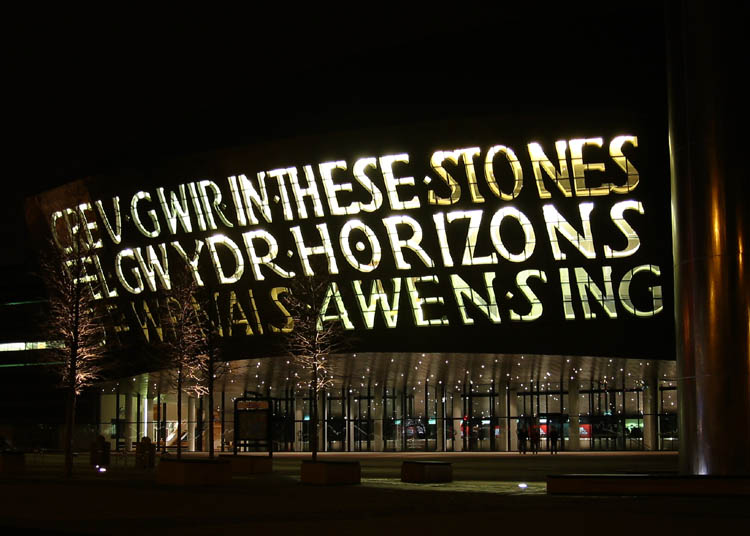 이 기념비적인 비문의 아이디어는 로마 건축(Roman architecture)에서 비롯되었다. 로마인들은 이 섬에 기독교를 가져왔고, 돌을 새기는 관습도 가져왔다. 켈트 십자가의 형태는 토착 문화와 로마 문화의 상호 수정, 즉 웨일스 민족이 처음으로 등장한 곳을 구현한다. 기념비적인 비문은 로마 건축의 친숙한 특징이다. 웨일스 밀레니엄 센터 입구 위의 비문은 이 고전적 전통의 부활이자 우리 국가에 대한 로마 문화의 형성적인 영향에 대한 인식이다. 우리는 두 개의 언어를 갖게 된 것을 행운으로 여긴다. 하나는 세계의 절반과 공유하고 하나는 우리에게만 속한다. 노래, 이야기, 시의 단어들은 웨일스를 자랑스러운 국가로 만드는 데 도움이 되었다. ''—조나단 아담스''[34]