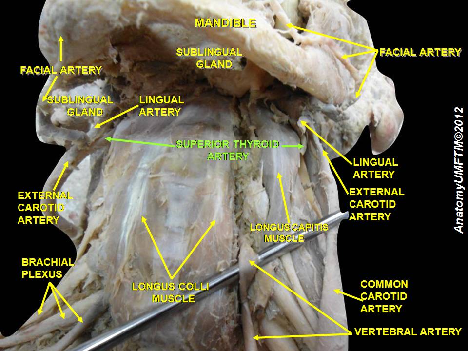 목빗근 앞쪽 경계 아래에서 시작하여 위갑상동맥은 짧은 거리를 따라 위쪽 및 앞쪽으로 뻗어 경동맥 삼각으로 이동하며, 여기서 피부, 넓은 목근, 근막에 의해 덮입니다. 그런 다음 어깨목뿔근, 흉골설골근, 흉골갑상근 아래로 아치형으로 굽어집니다.