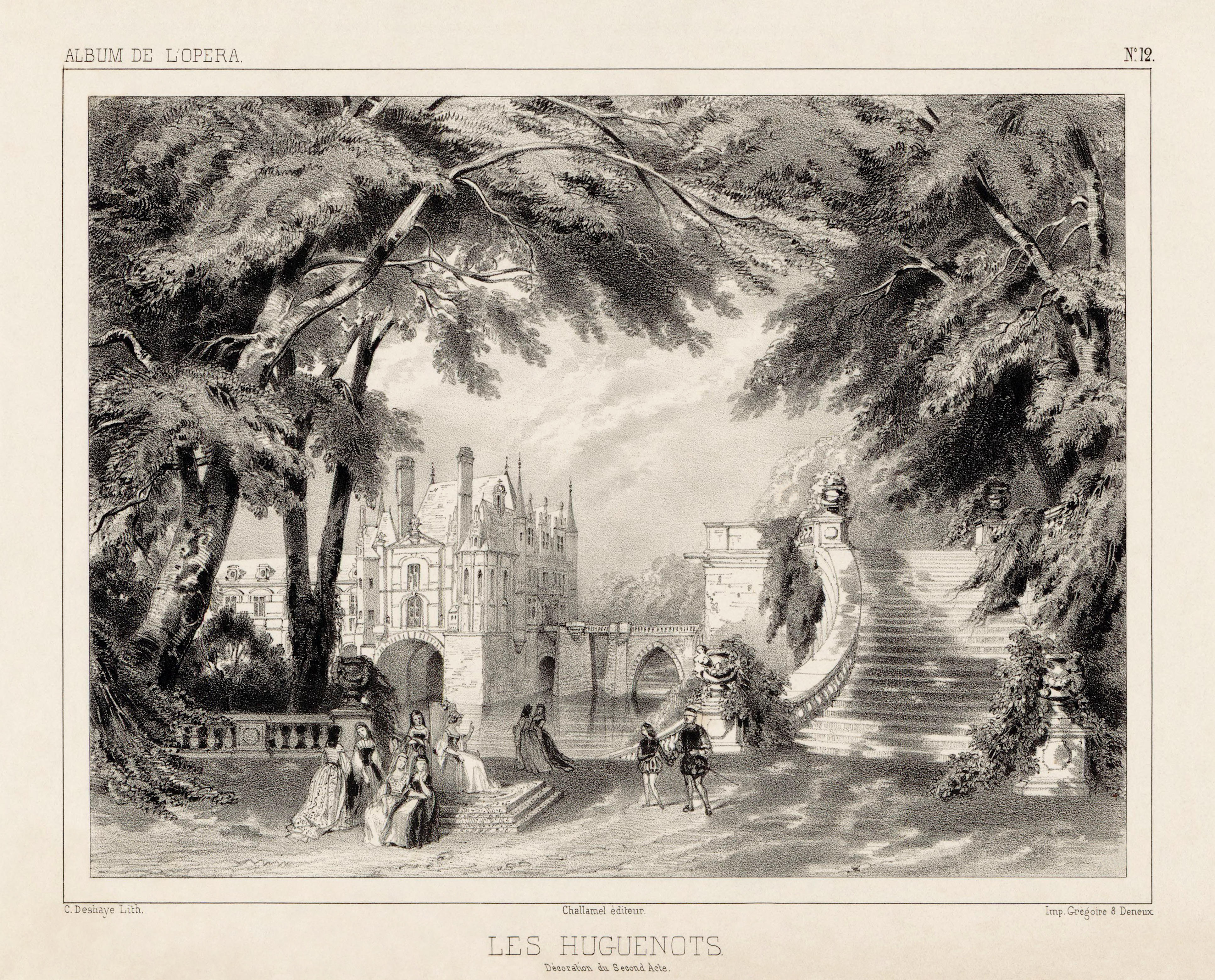 《위그노 교도》는 프랑스 종교 전쟁을 배경으로 한 자코모 마이어베어의 그랜드 오페라로, 1836년 파리에서 초연되어 즉각적인 성공을 거두었다. 이 오페라는 성 바르톨로메오 축일의 학살을 중심으로, 가톨릭과 위그노 간의 갈등 속에서 벌어지는 사랑 이야기를 다룬다. 루터의 코랄 "내 주는 강한 성"을 주제로 사용하여 종교적 갈등을 상징적으로 표현했으며, 엑토르 베를리오즈는 악기 편성과 성악 앙상블의 효과를 극찬했다. 20세기 초 인기를 잃었지만, 최근 부활 공연이 이루어지고 있으며, 현재도 재해석을 통해 무대에 올려지고 있다.