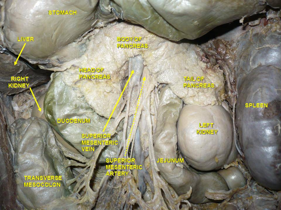 위창자간막동맥과 주변 구조 사이의 위치 관계를 보여주는 해부.