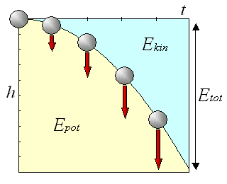 그림은 낙하하는 물체의 에너지 변화를 나타낸다. ''h''는 물체의 높이, ''t''는 시간, ''Epot''는 위치 에너지, ''Ekin''는 운동 에너지, ''Etot''는 역학적 에너지이다. 물체의 낙하에 따라 위치 에너지(노란 부분)는 감소하고, 운동 에너지(파란 부분)는 증가한다.