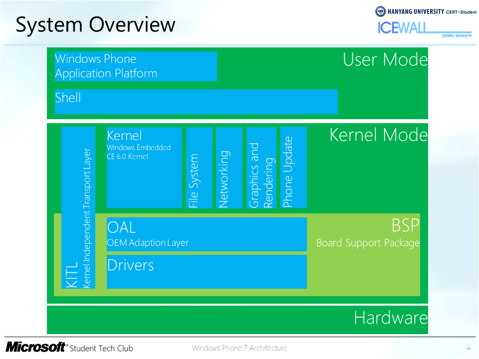 소프트웨어는 크게 커널 모드와 사용자 모드로 나눌 수 있다. 커널 모드는 다시 BSP(Board Support Package)와 나머지 모듈들로 나눌 수 있는데, BSP는 하드웨어 제조 업체에서 하드웨어와 운영 체제를 연결하기 위해 만드는 소프트웨어 계층이며, 커널 모드의 나머지 모듈들은 일반적인 운영 체제와 기능이 유사하다.[91]