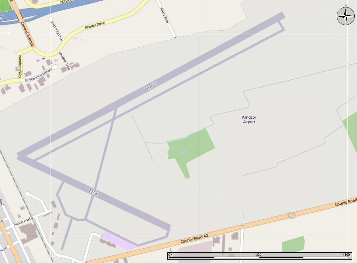 항행 보조 시설 | 무지향 표지 시설(NDB): 윈저(QG), 353 kHz, 공항에서 250° 3.8NM 방향; 로렐(ZQG), 398 kHz, 공항에서 70° 방향 계기 착륙 장치(ILS): 활주로 25 (IQG) |