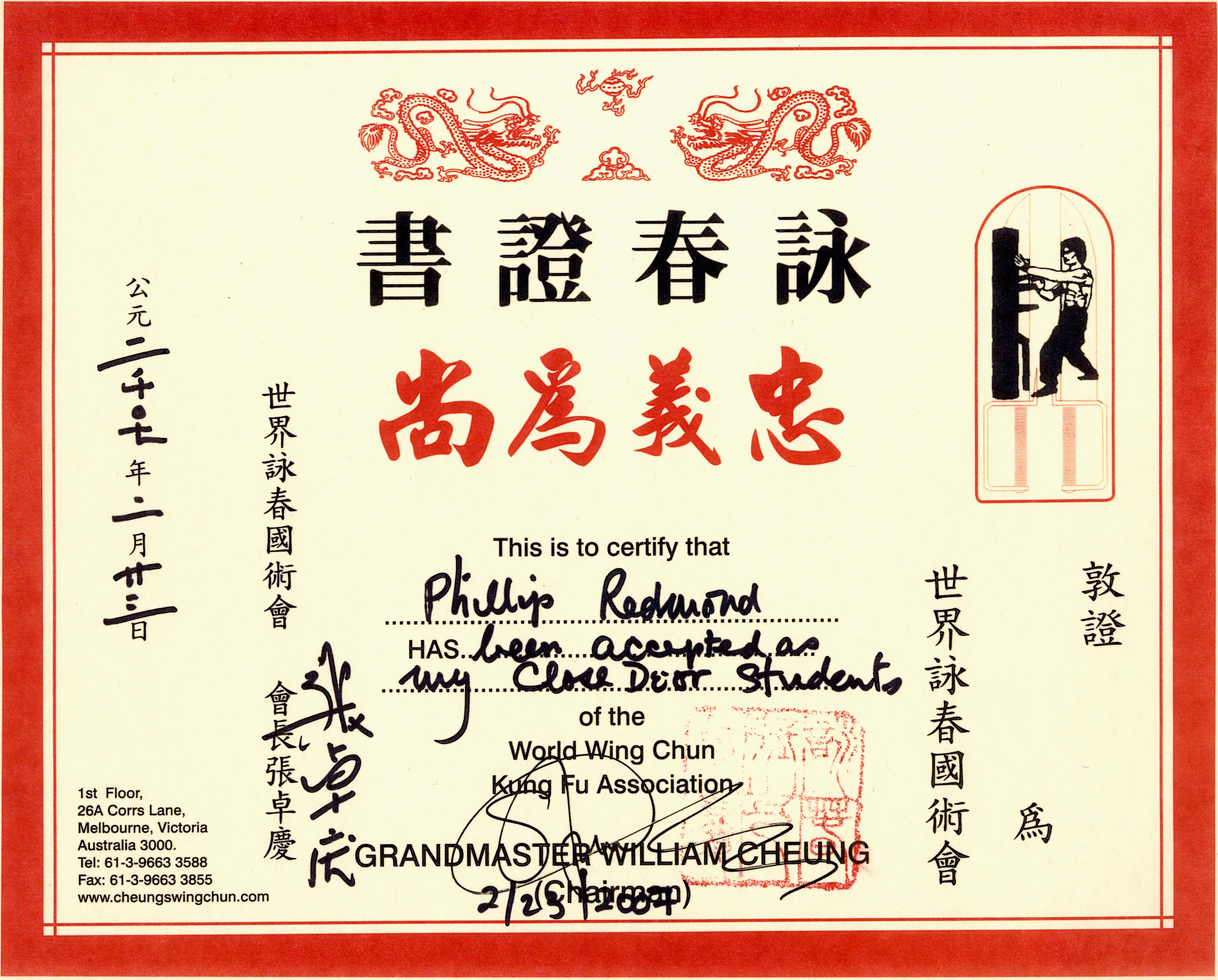 윌리엄 청은 현재 호주에 정통 영춘권 본부를 두고 있으며 미국, 독일, 유럽에 각 지부를 두고 있다. 정통 영춘권은 발 자세와 손의 위치가 진화순식 변형된 영춘권과 다르다. 장탁경 노사는 현재까지 오직 두 명의 제자에게 수제자(Closed Door Student)의 영광을 주었다. 이들은 미국에 본부를 둔 키스 마자(Keith Mazza) (Master Keith Mazza)와 필립 레드몬드(Phillip Redmond) (Master Phillip Redmond)이며 정통 영춘권의 완벽한 계승자이다. 다음의 엽문의 정통 영춘권 계보를 통해서 엽문에게서 영춘권이 어떻게 보급되고 있는지를 알 수 있다.정통 영춘권 가계 계보