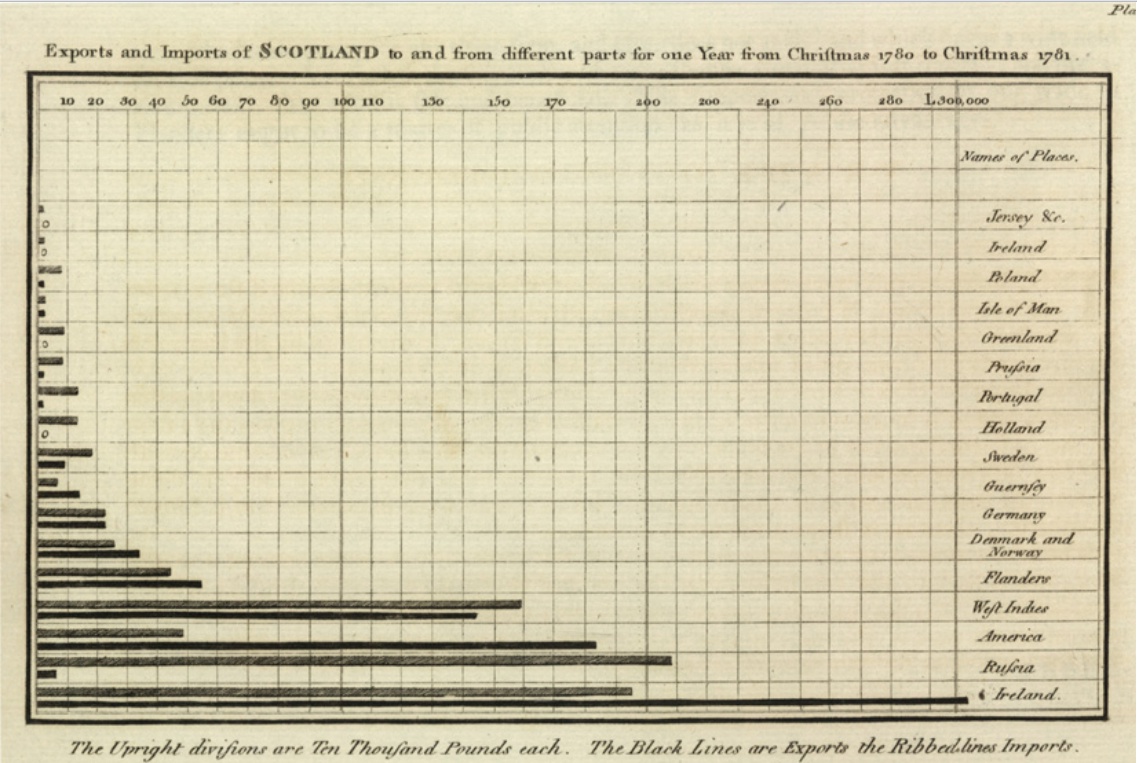 이 막대 그래프는 1781년에 스코틀랜드와 무역한 열일곱 개 국가의 수출입을 나타낸 것으로, 각 국가와의 무역 규모를 한눈에 비교할 수 있도록 했다. 이는 이전에는 존재하지 않았던 새로운 형태의 데이터 시각화 방법이었다.[54]