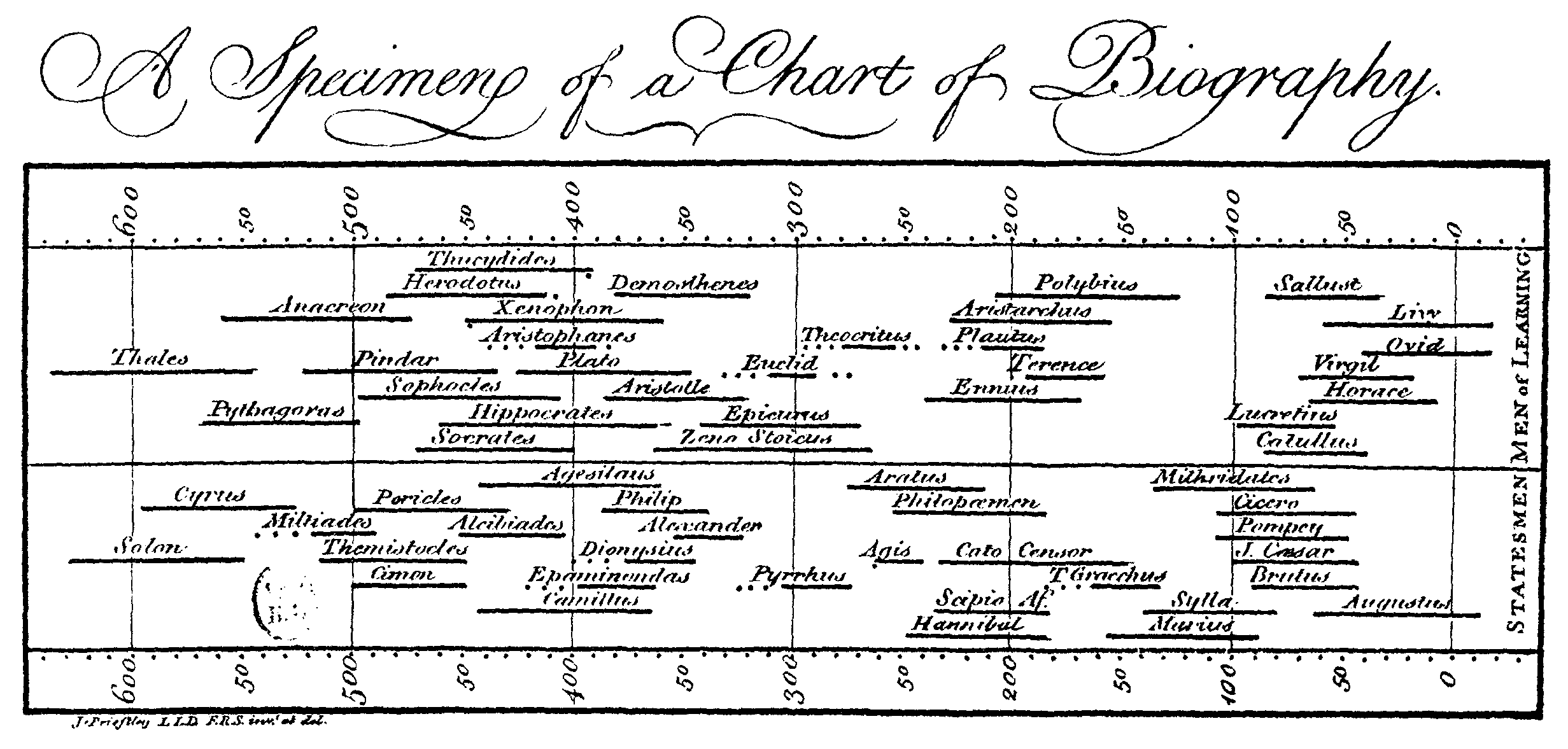 조지프 프리스틀리는 1765년에 타임라인 차트를 만들었는데, 이 차트에서 각 막대는 한 사람의 수명을 나타냈고, 전체 그래프는 여러 사람의 수명을 비교하는 데 사용되었다. 제임스 R. Beniger와 로빈(1978년)에 따르면 "프리스틀리의 타임라인은 상업적 성공과 대중적 환호를 이끌었으며 수많은 변종을 낳았다."[54]