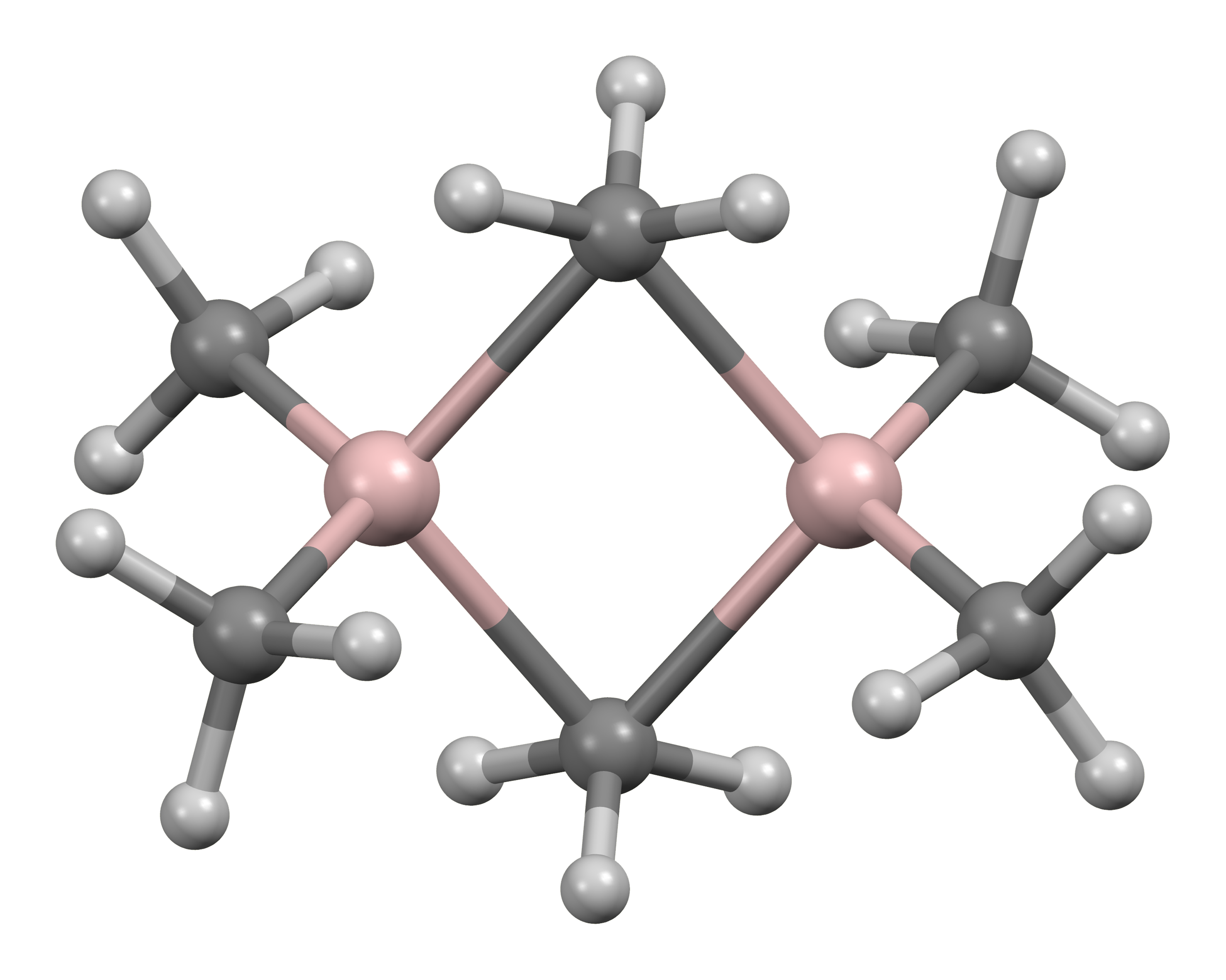 - 유기알루미늄 화합물: 트리메틸알루미늄(Me3Al)은 메틸 그룹이 가교 리간드로 작용하는 구조를 가지며, 일부 알코올의 산업적 생산에 사용된다.[2] 치글러-나타 촉매는 알루미늄을 포함하는 유기금속 화합물로, 폴리머 합성에 중요한 역할을 한다.[29][30][31]