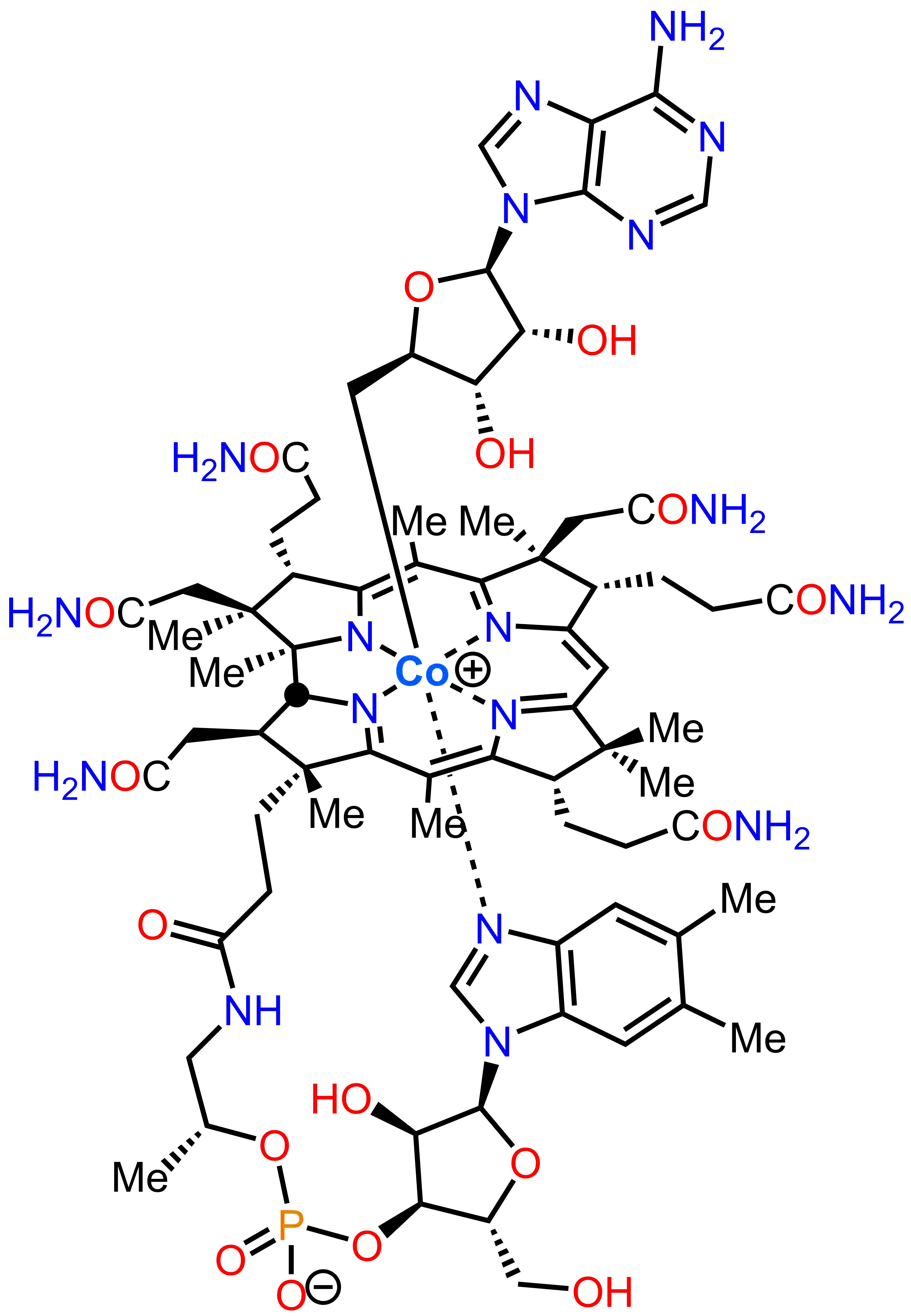 - 유기코발트 화합물: 코발토센(Co(C5H5)2)은 페로센과 유사한 구조를 가지지만 공기에 매우 민감하다. 자연적으로 발생하는 유기코발트 화합물로는 메틸코발라민(비타민 B12의 한 형태)과 아데노실코발라민이 있으며, 이들은 생체 내에서 중요한 역할을 하는 조효소이다.