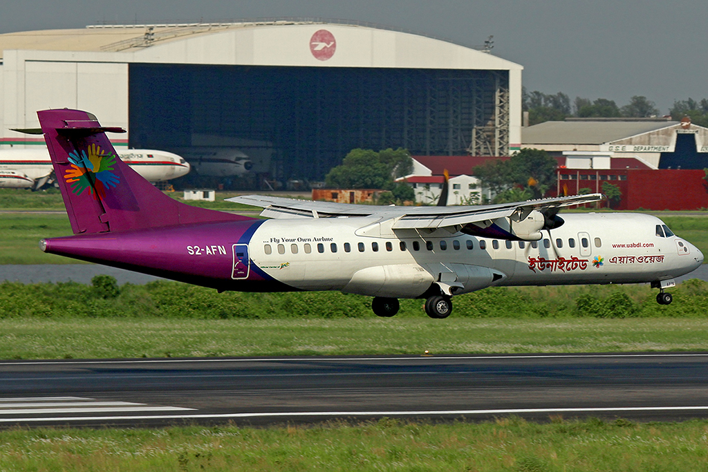 • 2012년 8월 13일: 유나이티드 항공 '''546편'''(ATR 72-212, 등록 번호 ''S2-AFE'')이 조레에서 다카로 비행하던 중, 고도 약 2743.20m에서 기압 문제로 부조종사 쪽 앞 유리가 파손되었다. 기장샤잘랄 국제공항에 안전하게 착륙했고, 부조종사는 눈에 부상을 입었다.[42]