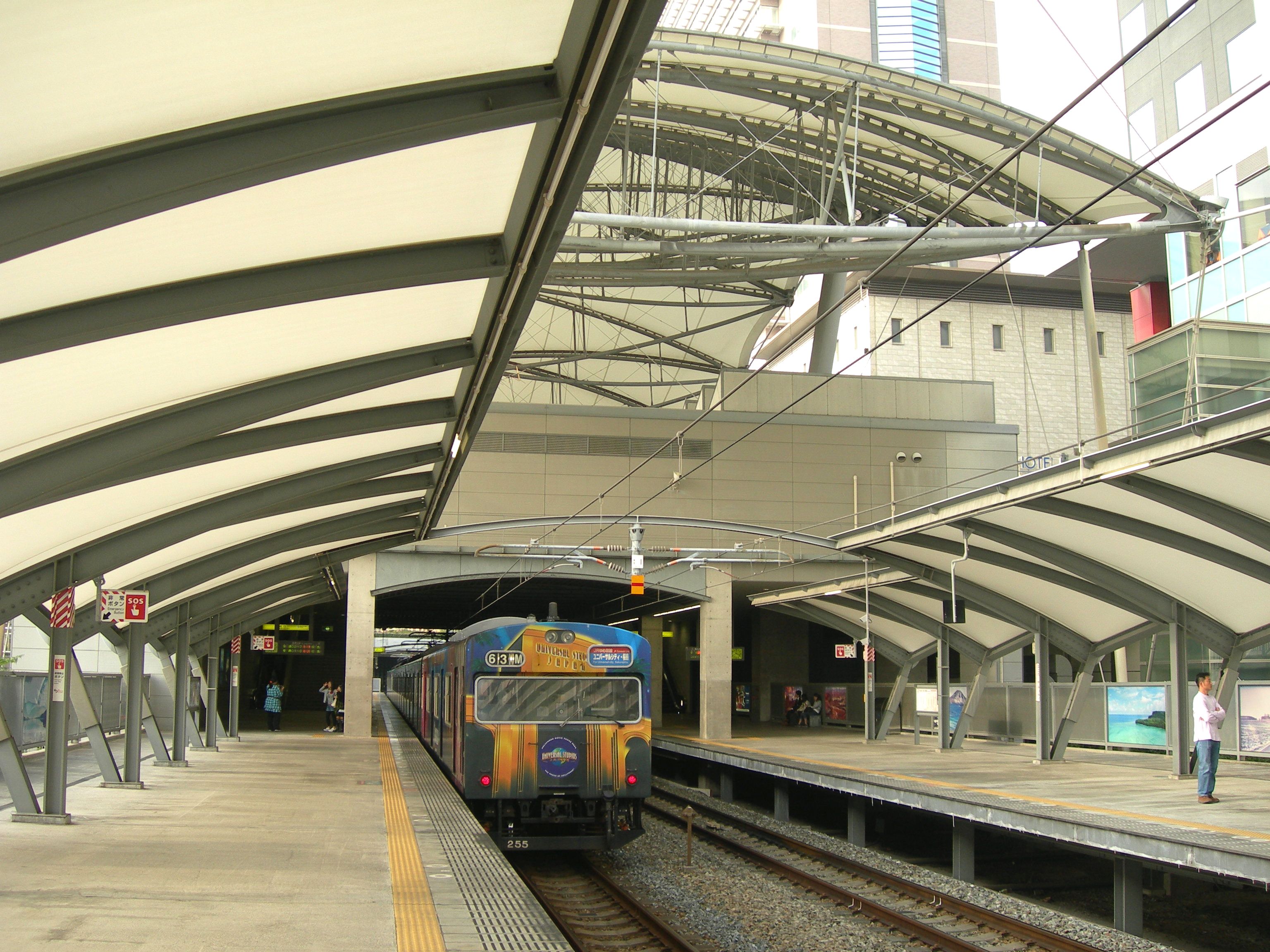 이 역은 개찰구와 자동 발권기가 있는 육교 아래에 2개의 선로를 운행하는 2개의 상대식 승강장을 가지고 있다. 역 건물은 건축가 안도 다다오가 설계했다. 상대식 승강장 2면 2선을 가진 지상역이며, 교상역사를 갖추고 있다. 안도 다다오가 설계한 범선을 본뜬 유선형의 흰색 막 구조 지붕이 특징이다.[7] 2면 2선이라는 단순한 구조이지만, 복선 단선 운전에 대응하기 위해 출발 신호기가 있다. 개찰구는 1곳이며, 일본어와 영어 방송이 나온다.
