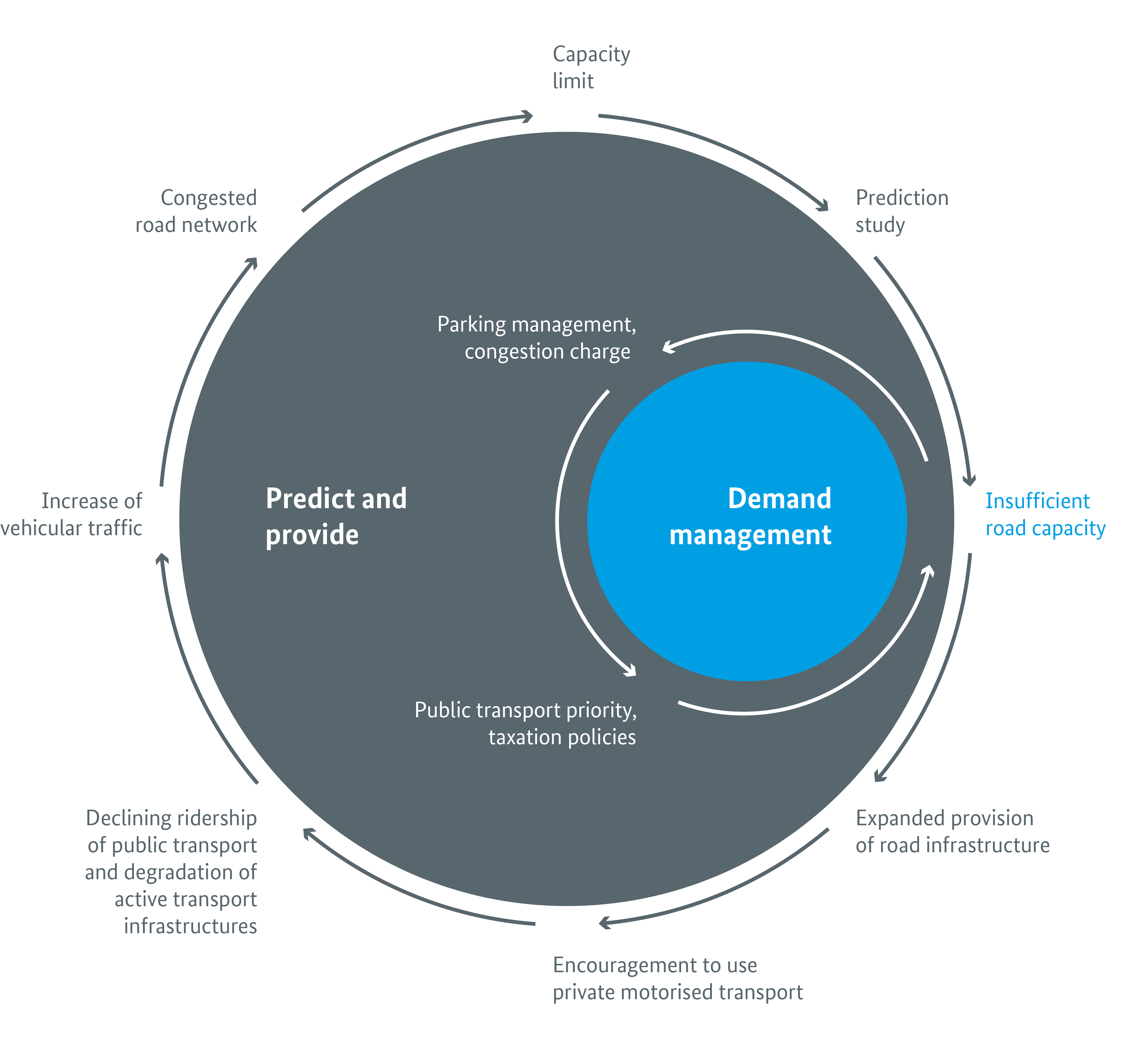 | 수요 관리 | 유도된 수요를 억제하기 위해 교통 혼잡세, 주차 요금 인상, 대중교통 요금 할인 등의 정책을 시행할 수 있다. |