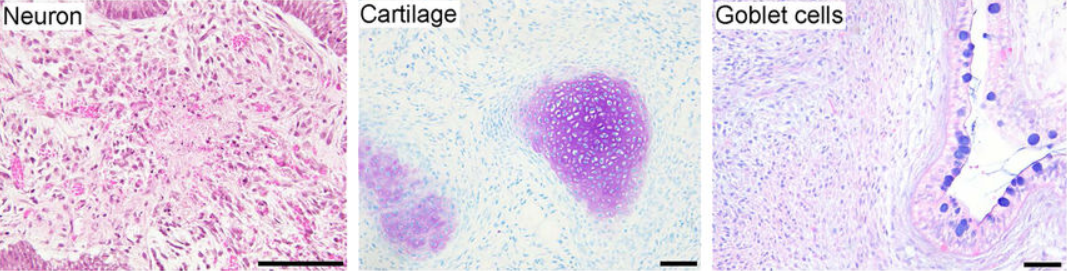 기형종 형성 | iPSC를 면역 결핍 마우스에 주입하면 9주 후에 세 개의 배엽인 내배엽, 중배엽, 외배엽에서 유래된 조직을 포함하는 기형종이 자발적으로 형성된다. |
