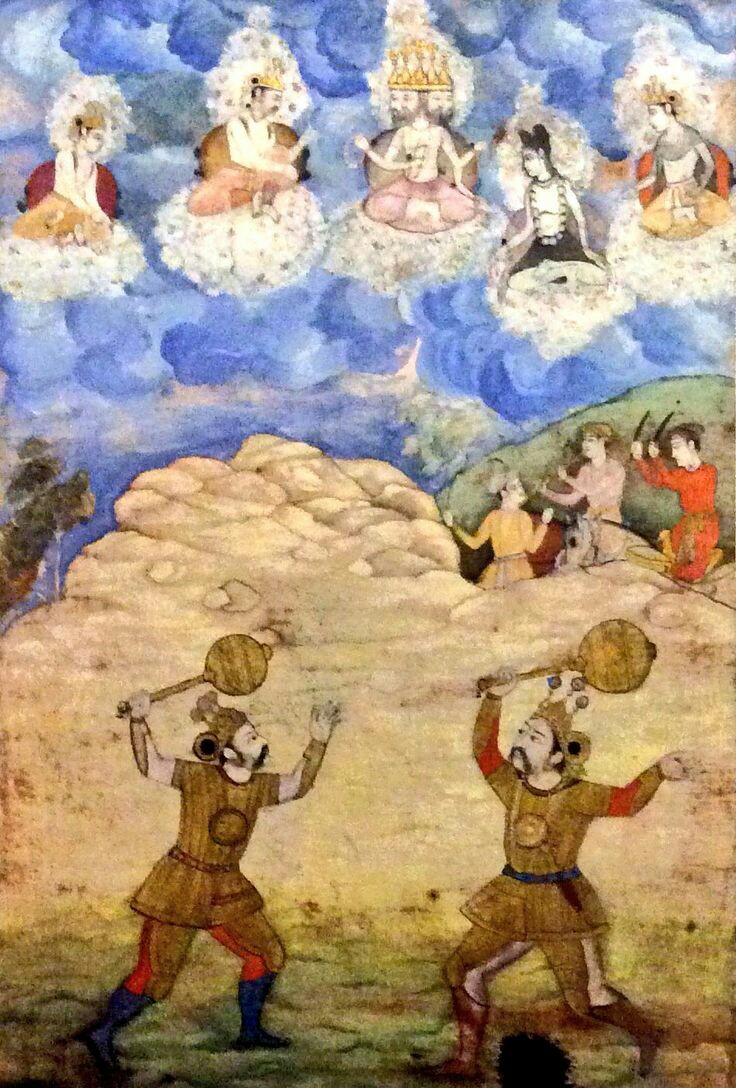 두료다나가 늪에 숨자, 유디슈티라는 두료다나에게 판다바 중 누구와도 결투를 제안하며, 승리하면 하스티나푸라의 왕위를 주겠다고 약속한다.[37] 두료다나는 비마를 선택했고, 비마가 두료다나를 쓰러뜨린 후 모욕하자 유디슈티라는 비마에게 전장에서 물러날 것을 명령한다.[38]