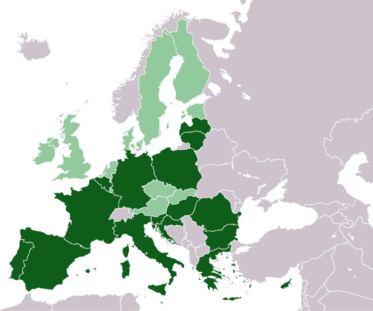 유럽 법은 회원국이 부여한 모든 영역에서 국내법보다 우선하며, 에너지 및 환경 정책에서 소비자 권리와 형사 사법에 이르기까지 광범위하게 적용된다. 유로는 20개 유로존 EU 국가에서 공식적으로 채택되었으며, 다른 두 회원국은 통화를 ERM II의 유로에 연동시켰다. 안도라, 모나코, 산마리노, 바티칸 시국과 같은 비EU 회원국들은 유로 사용에 대한 통화 협정을 EU와 체결했고, 코소보몬테네그로는 유로를 일방적으로 채택했다.