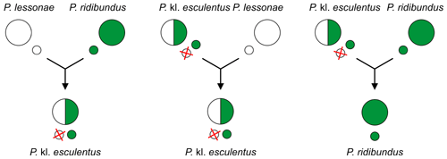 풀개구리(Pelophylax lessonae), 늪개구리(Pelophylax ridibundus)와 그들의 잡종인 식용 개구리(P. kl. esculentus) 간의 교배 예시. 첫 번째는 잡종을 생성하는 주요 교잡이며, 두 번째는 가장 널리 퍼진 유형의 잡종생식이다.