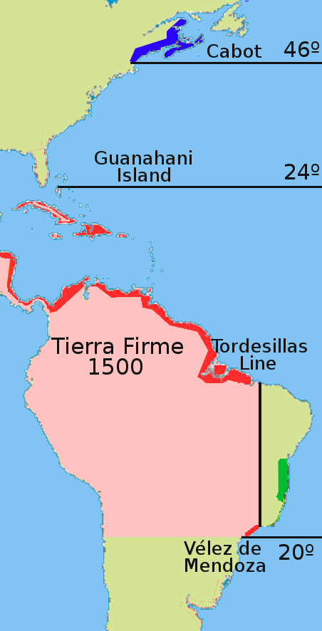 이베리아의 최종 레콩키스타 이후, 토르데시야스 조약이 교황에 의해 비준되었고, 카스티야 (스페인의 다른 왕국들과의 동군 연합)와 포르투갈의 두 왕국은 1494년에 비준되었다. 이 조약은 비유럽 세계 전체를 탐험과 식민지화의 두 영역으로 나누었다. 경도 경계선은 대서양과 현재 브라질 동부를 관통했다.