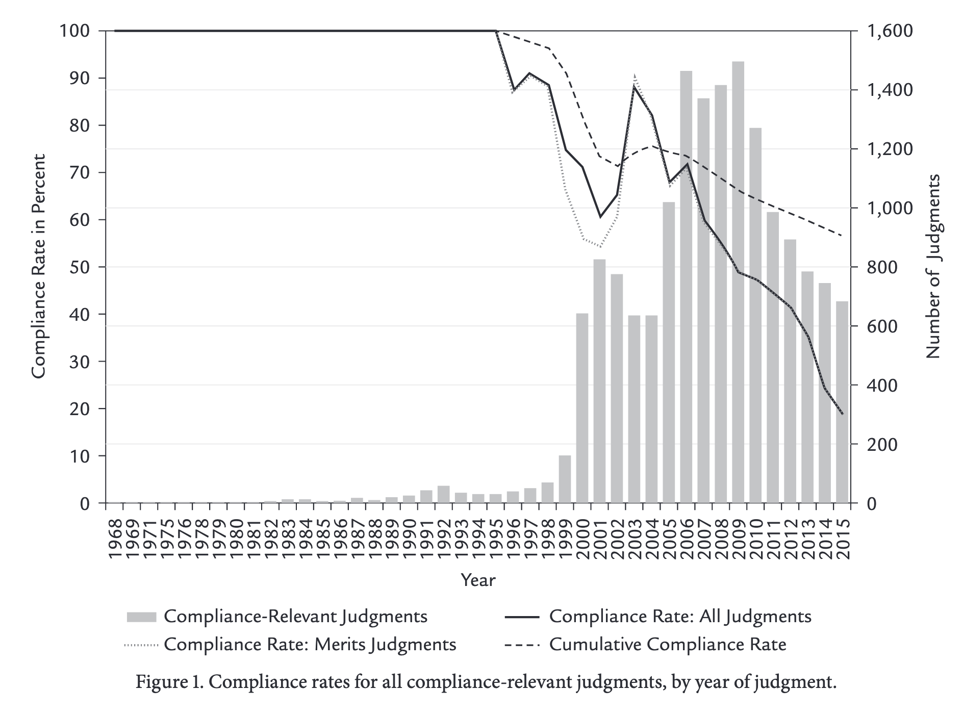 유럽 평의회 각료 위원회는 법원의 판결 집행을 감독하는 책임을 맡고 있다. 각료 위원회는 체약국이 협약과 일치하도록 자국법을 변경하거나, 위반 사항을 시정하기 위해 체약국이 취한 개별 조치를 감독한다. 법원의 판결은 관련 응답 국가에 구속력을 가지며, 국가는 일반적으로 법원의 판결을 준수한다.[16]