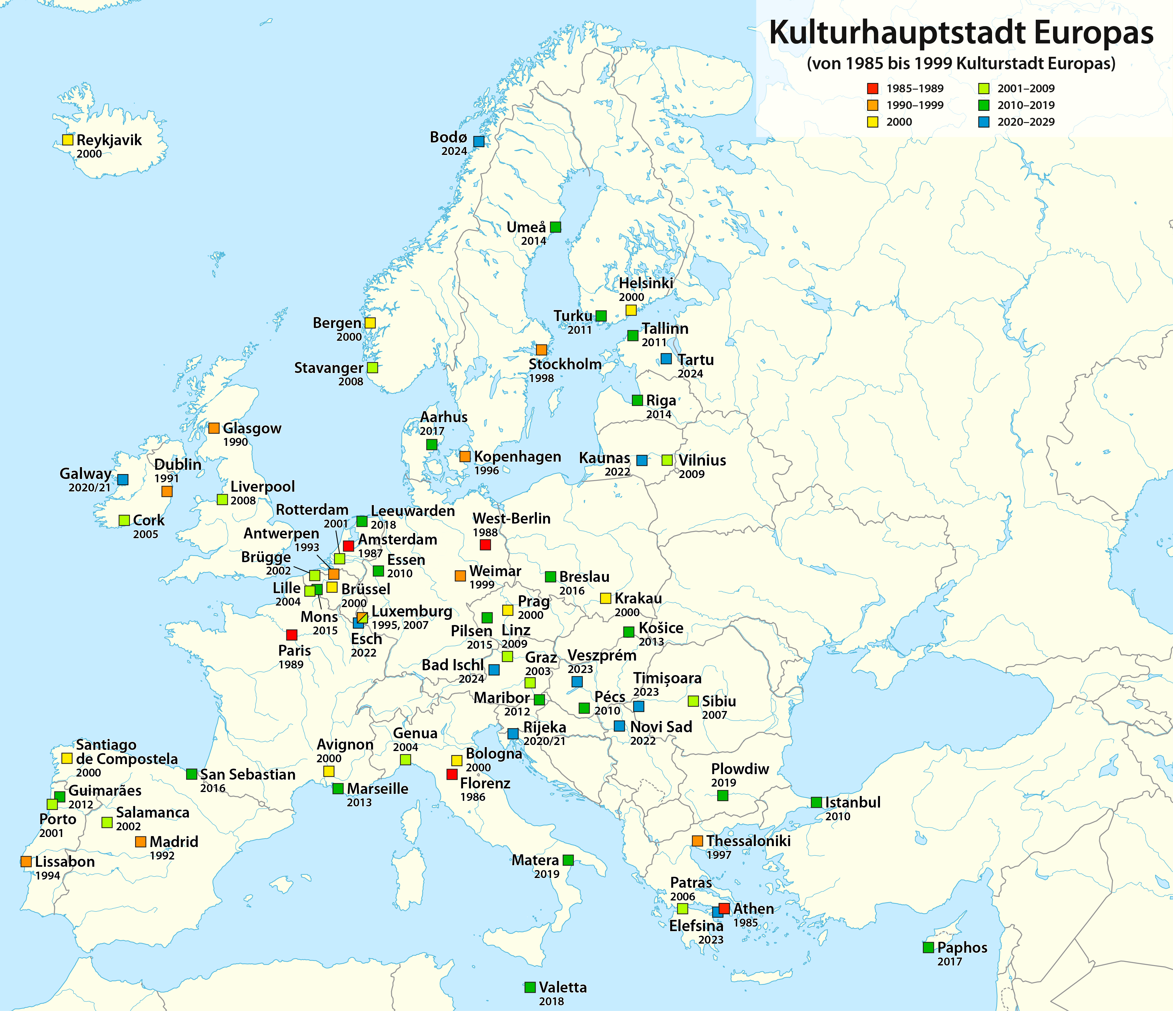 1999년, 유럽 문화 도시에서 '''유럽 문화 수도'''로 명칭이 변경되었다.[6]
