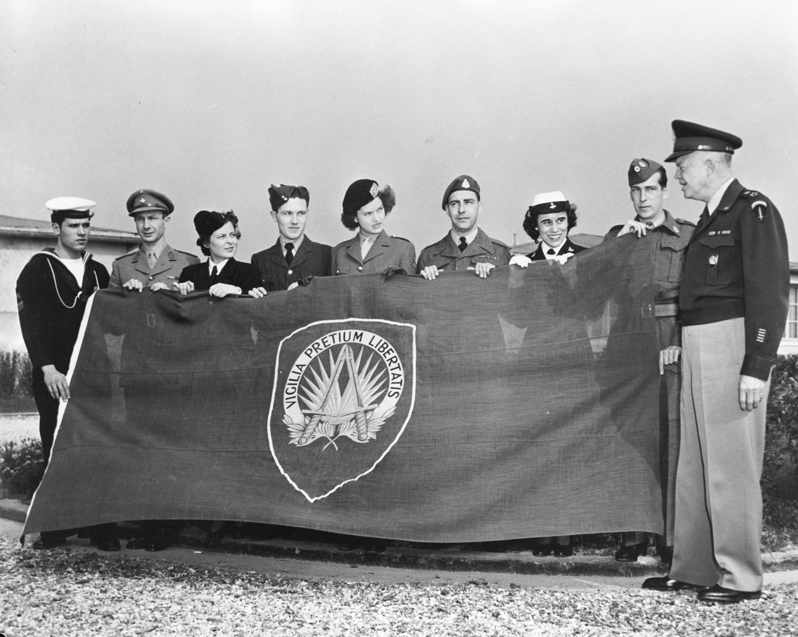 1951년 10월 8일 SHAPE 깃발 앞에서 드와이트 아이젠하워 장군