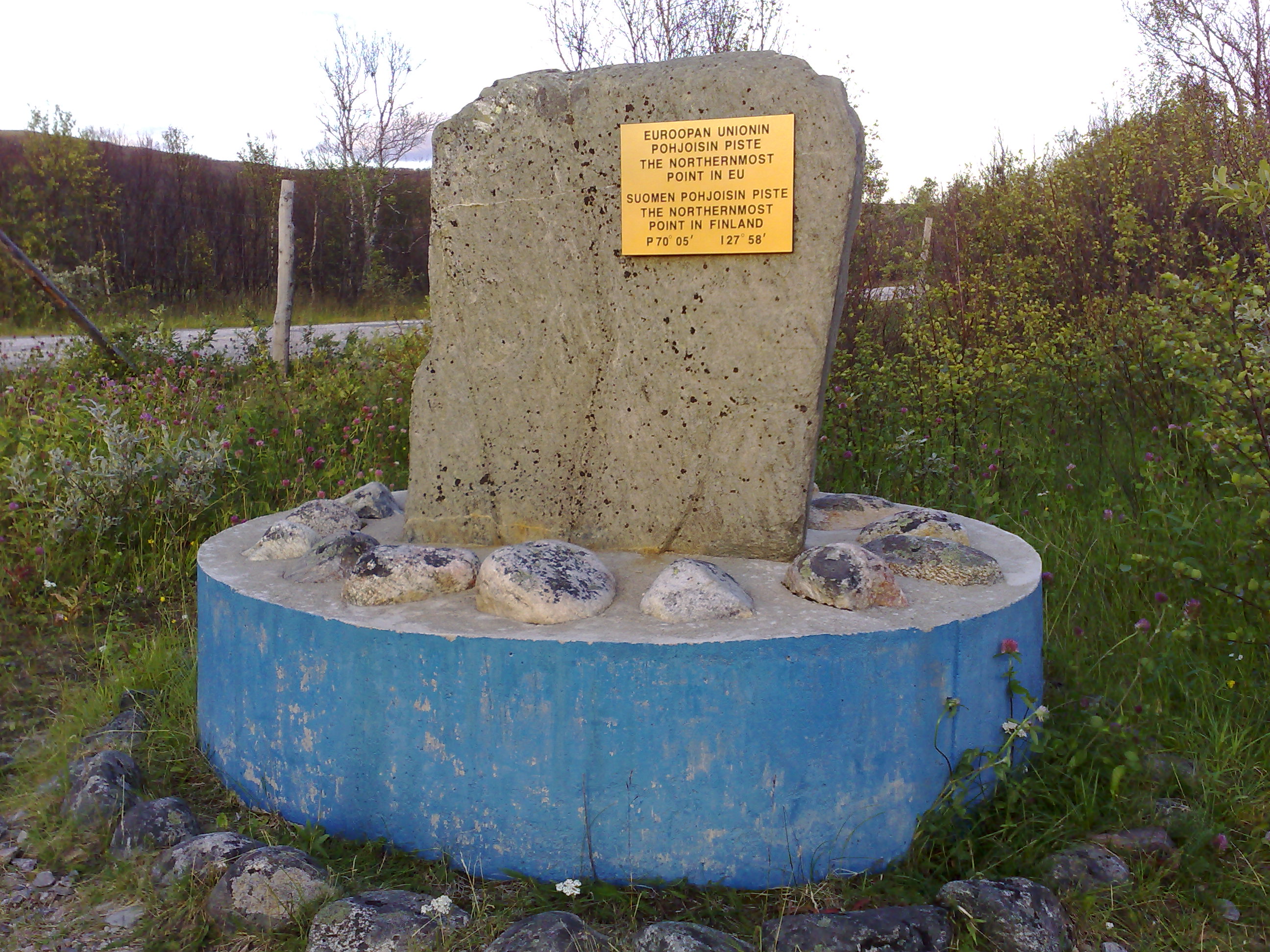 누오르감 근처 핀란드의 유럽 연합 최북단 근처 도로의 국경 표지판. 강에 정확한 지점에도 표지판이 있다.