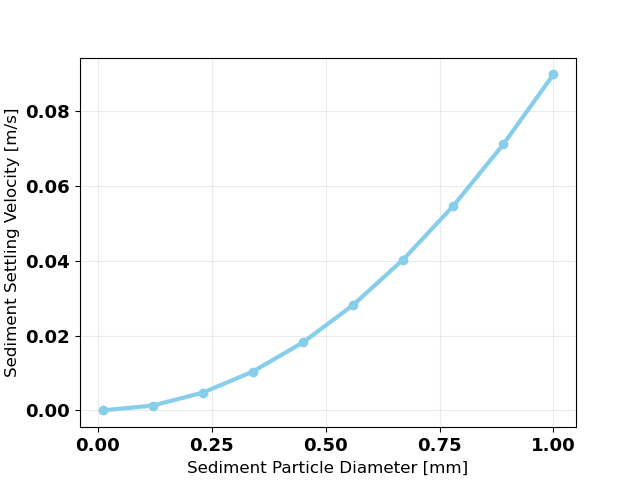 침강 물질 부하는 하상 하중과 하상에서 유래된 부유 하중의 일부로 구성된다. 주요 침강 물질 수송 공식에는 Ackers-White 공식,[36] Engelund-Hansen 공식, Yang 공식이 있다.[37] Ackers-White 공식은 모래에서 입자 크기의 자갈에 적용되며, Engelund-Hansen 공식과 Yang 공식은 모래에 적용된다. Yang 공식은 나중에 미세 자갈까지 확장되었다.