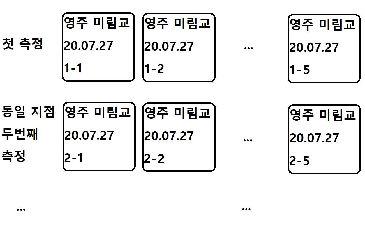 유사 시료통에는 미리 교량 이름, 채취 날짜, 측정 회차, 측선 번호를 적는다.[1] 측선 번호는 하천 하류를 바라본 상태에서 좌안부터 1번으로 한다.[1] 같은 유량이 되도록 하천 단면에 5~7개 이상의 측선을 설정하며, 긴급 시에는 3개 측선만 사용할 수 있다.[1] 측선 번호를 적을 때는 같은 장소에서 시간을 달리하여 여러 번 측정하므로 "(측정 회차) - (측선 번호)"와 같이 두 개의 숫자를 적는다.[1] 예를 들어 영주시 미림교에서 2020년 7월 27일 09시에 5개 측선을 두어 측정하는 경우 아래 그림과 같이 기록한다.[1]