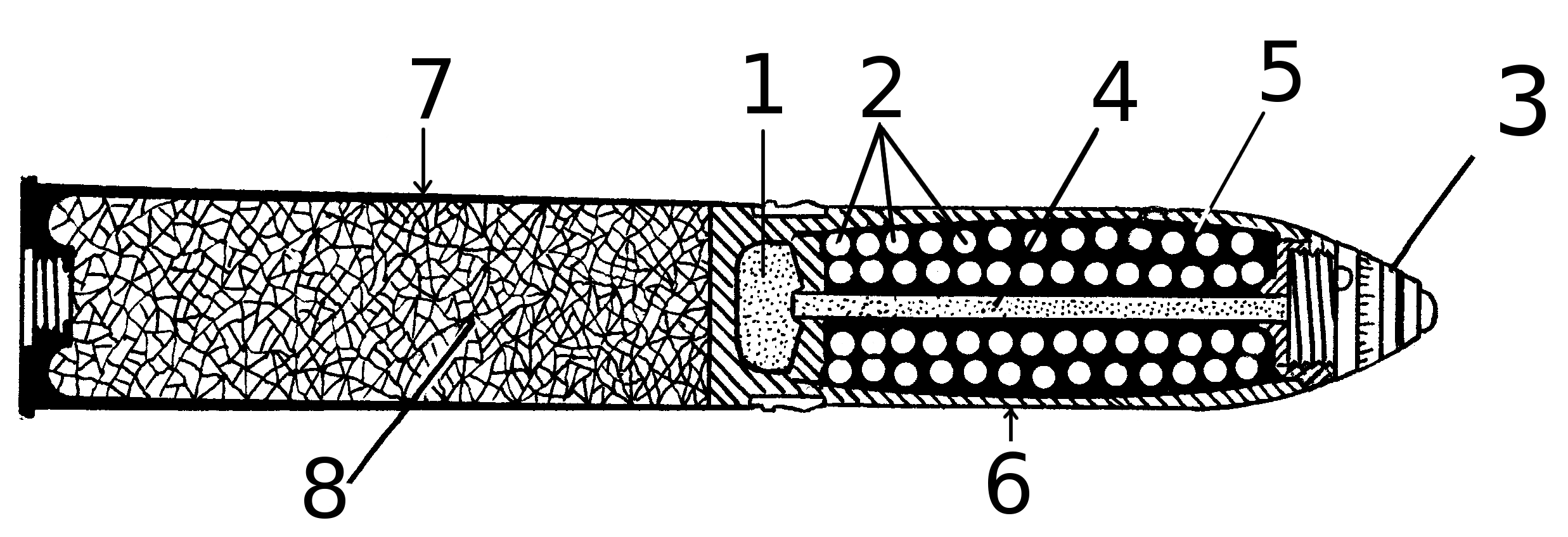 이 포탄은 두꺼운 주철 벽, 포탄 기저부의 화약 장약, 중앙 튜브를 통해 노즈의 시간 신관에서 기저부 화약 장약으로 점화 플래시를 전달하는 구조였다. 화약 장약은 주철 포탄 벽을 파괴하고 탄환을 방출했지만, 파손된 포탄 벽은 파괴 효과가 거의 없었다. 철 포탄 벽 두께와 중앙 튜브 때문에 탄환 탑재량이 제한되었다.[5][6]