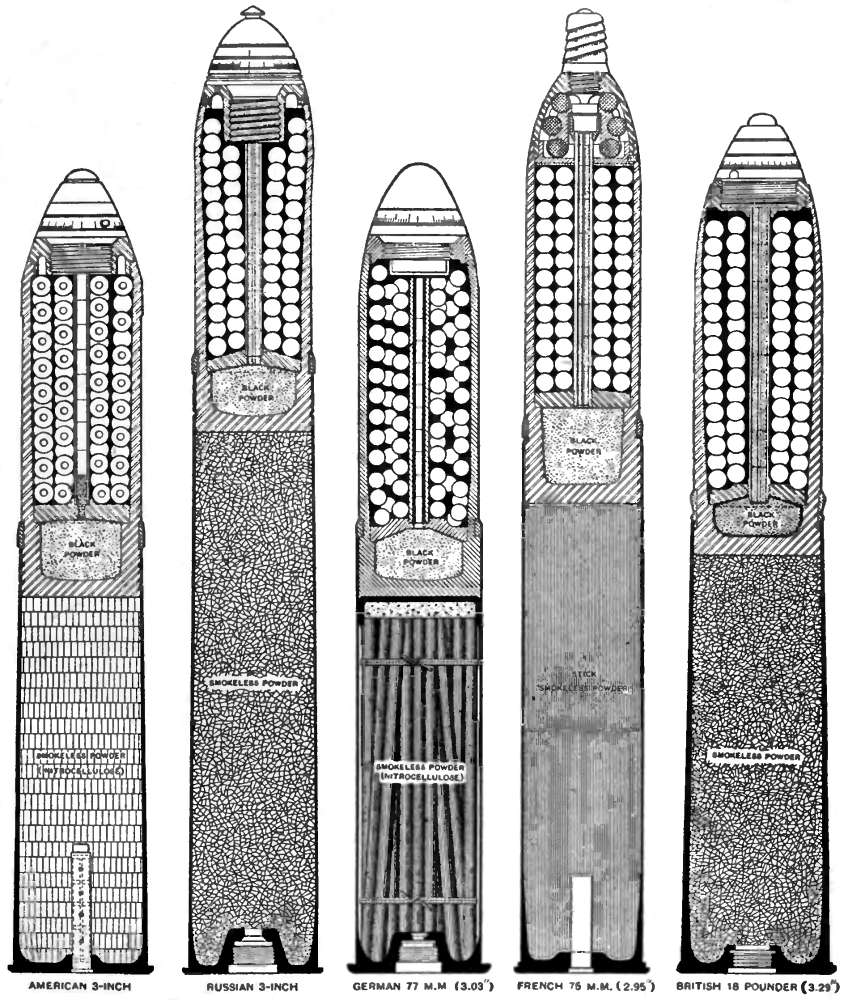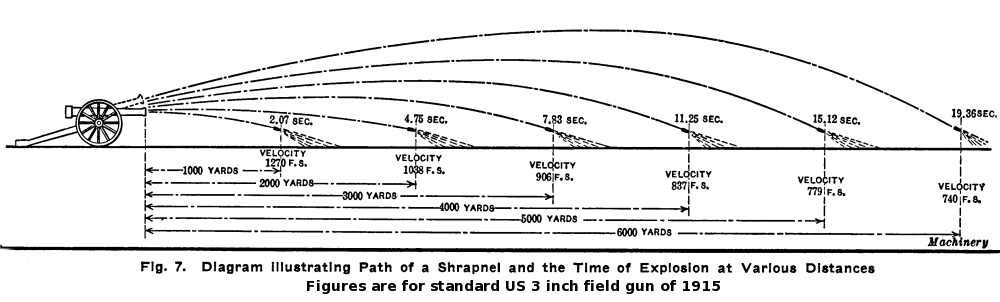 3000yards의 일반적인 전투 사거리에서는 탄도가 비교적 평평하여 탄환에 긴 "사격 범위"를 제공했다. 일반적인 3인치 또는 75mm 야포 유산탄 포탄은 약 초당 900피트의 속도를 가졌다. 파열 장약은 초당 150피트를 더해 탄환 속도는 초당 1,050피트가 된다. 이는 각 탄환에 약 418피트 파운드의 에너지를 부여하며, 이는 한 명을 무력화하는 데 필요한 에너지의 7배이다.