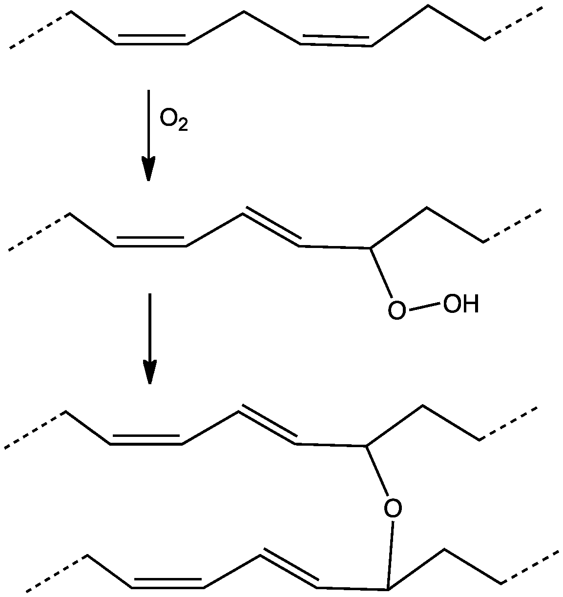 기름은 공기에 노출되면 물처럼 증발하지 않고 산화되어 반고형 상태로 중합을 일으킨다. 이 과정은 기름에 따라 매우 느릴 수 있다.