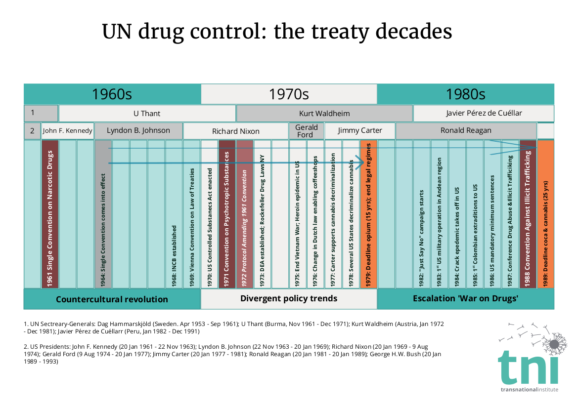 유엔 마약 범죄 사무소(UNODC)의 마약 관련 프로그램은 마약 관련 조약 세 가지를 기반으로 한다. 이 조약들은 다음과 같다. 1972년 의정서로 개정된 1961년 마약 단일 협약, 1971년 향정신성물질에 관한 협약, 그리고 1988년 마약 및 향정신성물질 불법 거래에 관한 유엔 협약이다.