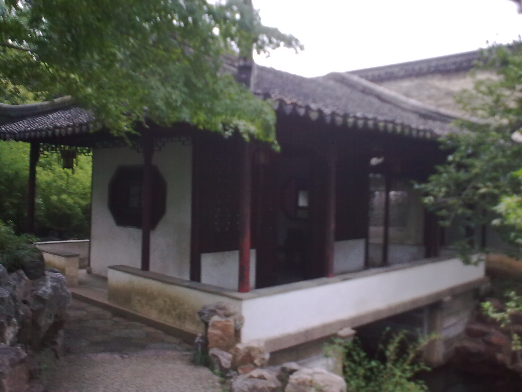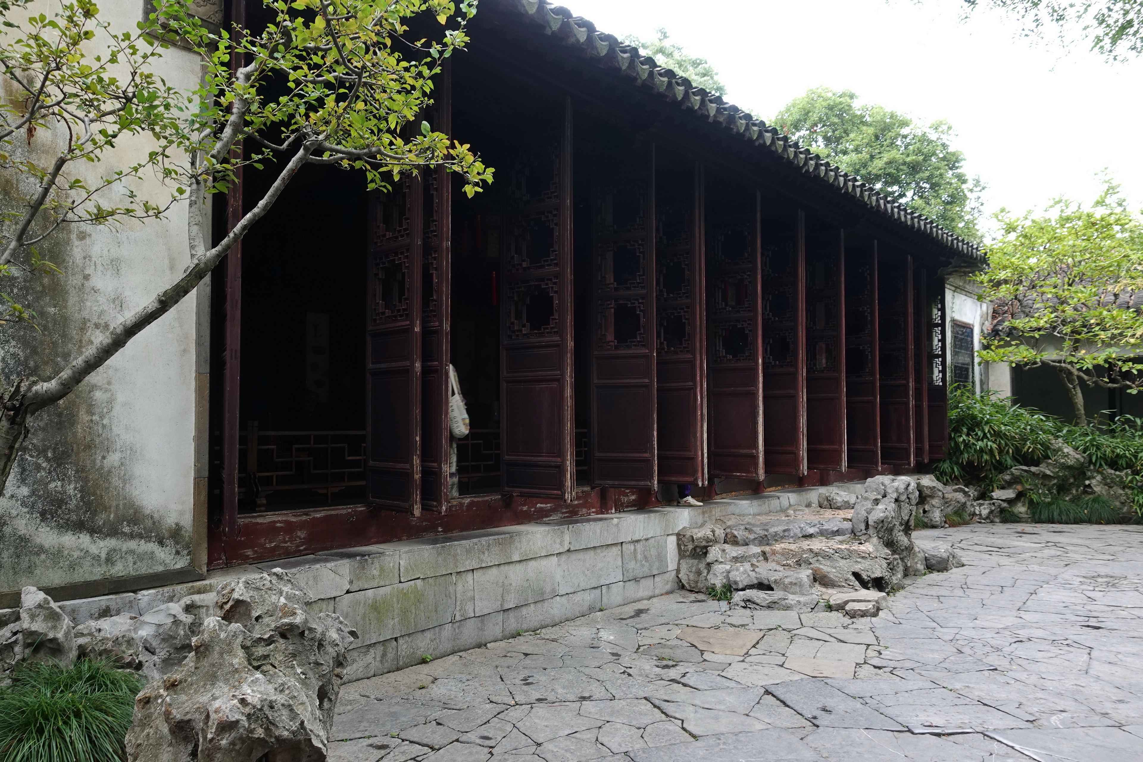 ![]() | 입구 류위안루에 있는 정원 입구. 흰 벽과 석재 상인방의 단순한 스타일은 사치 금지법의 결과로 고대 쑤저우 도시 디자인의 전형적인 특징이다. |