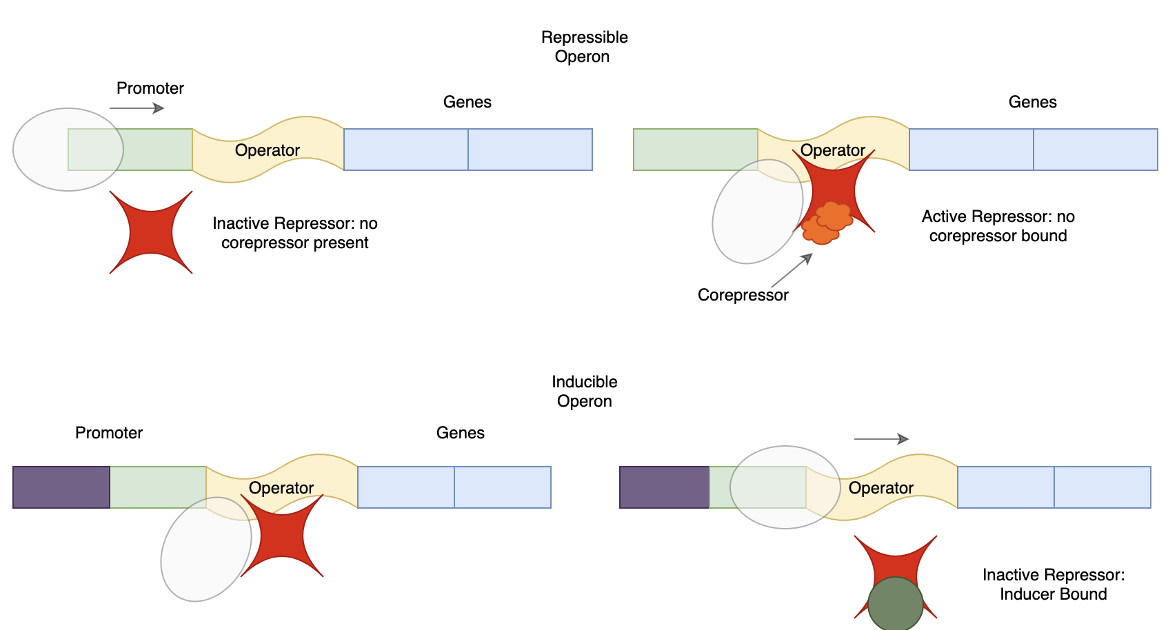 RNA 중합 효소가 결합하는 DNA 서열인 프로모터는 유전자 전사의 시작을 결정한다. 활성제가 결합하는 DNA 서열인 인핸서는 유전자 발현을 증폭시킨다. 억제자가 결합하는 DNA 서열인 사일렌서는 유전자 발현을 억제한다.[4]* '''상''': 유전자가 꺼진 상태. 억제자를 억제하는 젖당이 존재하지 않으므로, 억제자는 오퍼레이터에 결합한다. 그로 인해, RNA 중합 효소가 프로모터에 결합하여 젖당분해효소 합성이 시작되는 것을 방해한다.