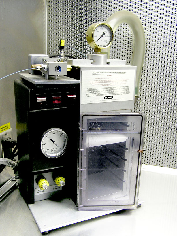 유전자총은 재조합 DNA를 미세한 금속으로 코팅한 후, 식물 세포를 향해 금속 입자와 함께 쏘아 식물체 내의 염색체에 외래 DNA가 삽입되도록 하는 기기이다.[377] 유전자총은 따로 재조합한 여러 종류의 DNA를 섞어서 발사하기 때문에 여러 유전자를 한 번에 이식할 수 있다는 장점이 있다. 유전자총법은 금 또는 텅스텐의 미세한 금속 표면에 DNA 물질을 묻혀서 총으로 쏘는 방식으로, DNA 물질이 세포 내부로 들어가게 된다. 이 방법은 비교적 성공 확률이 낮아, 다른 방법으로 유전 물질을 넣기 힘든 경우에 주로 사용된다.[377]