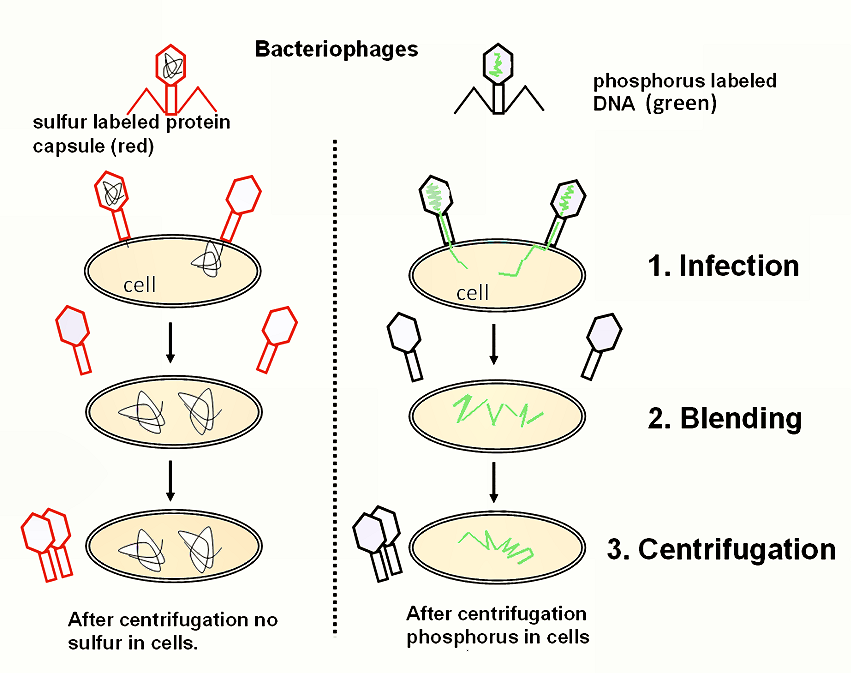허시와 체이스의 실험은 박테리오파지의 유전물질이 DNA임을 증명하였다.
