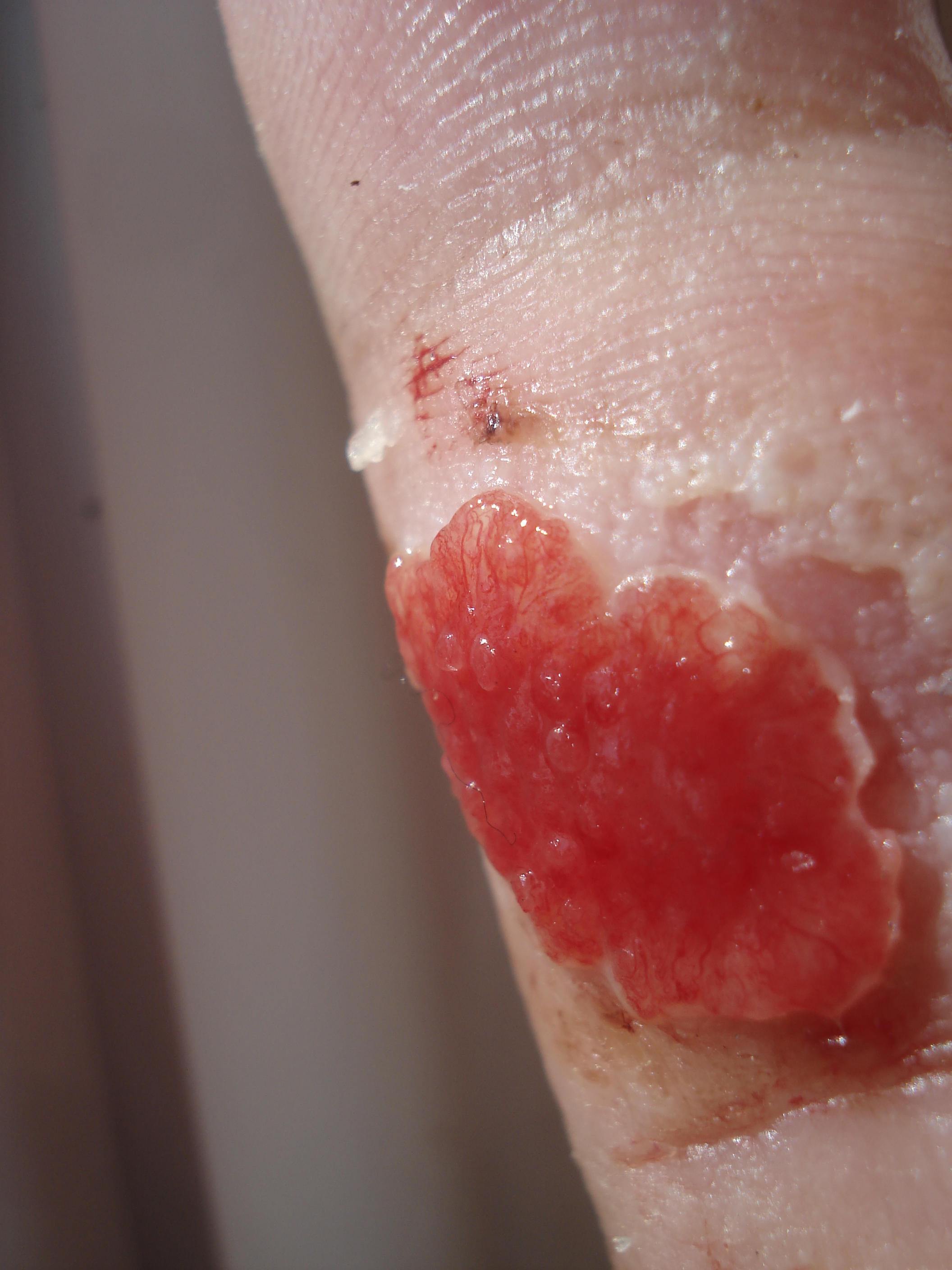 살이 차오르는 것과 같은 "과립 조직"으로 손가락이 베인 상처의 예