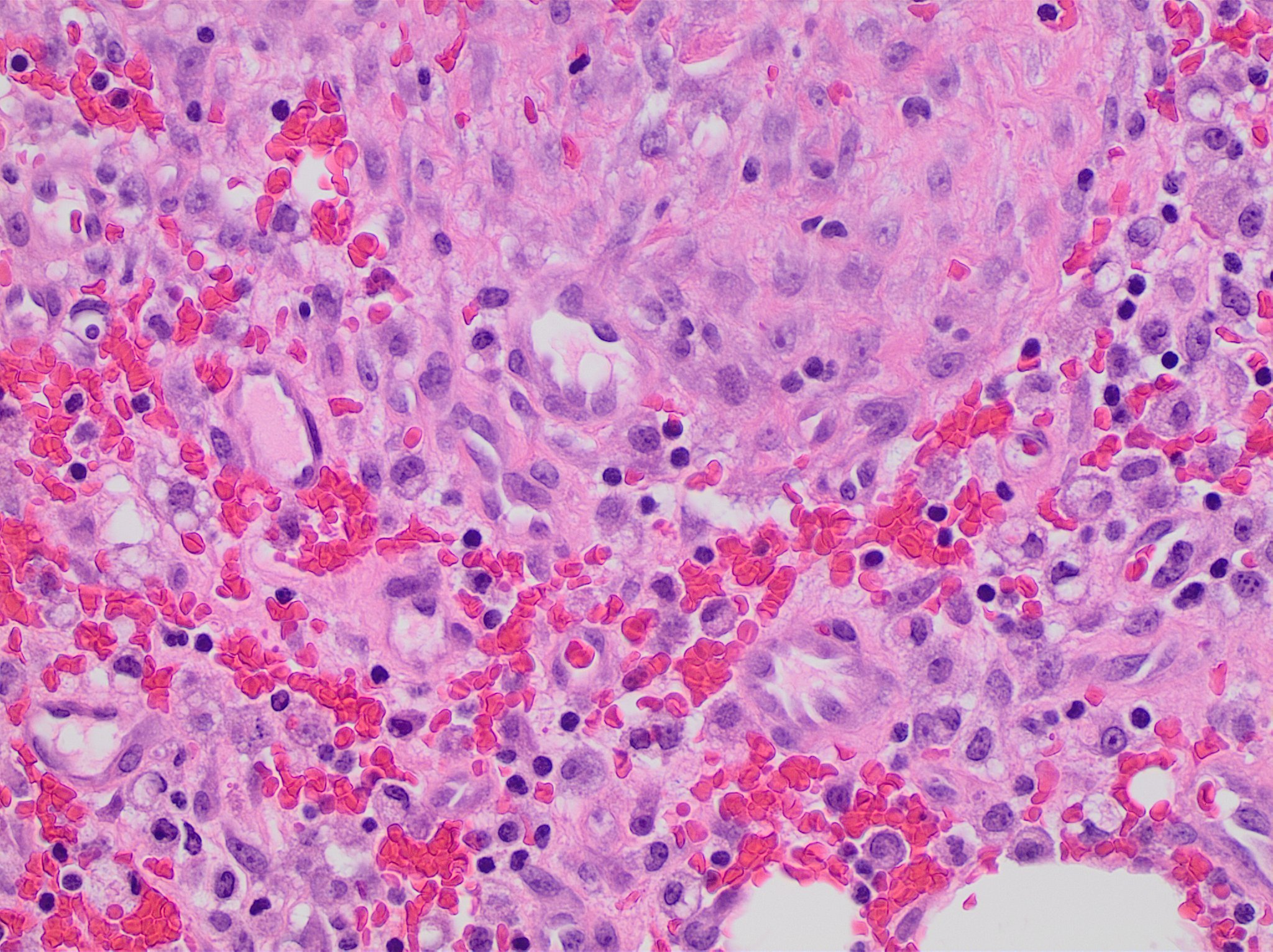 현미경 소견섬유아세포, 염증 세포 및 혈관 신생을 보이는 느슨한 결합 조직