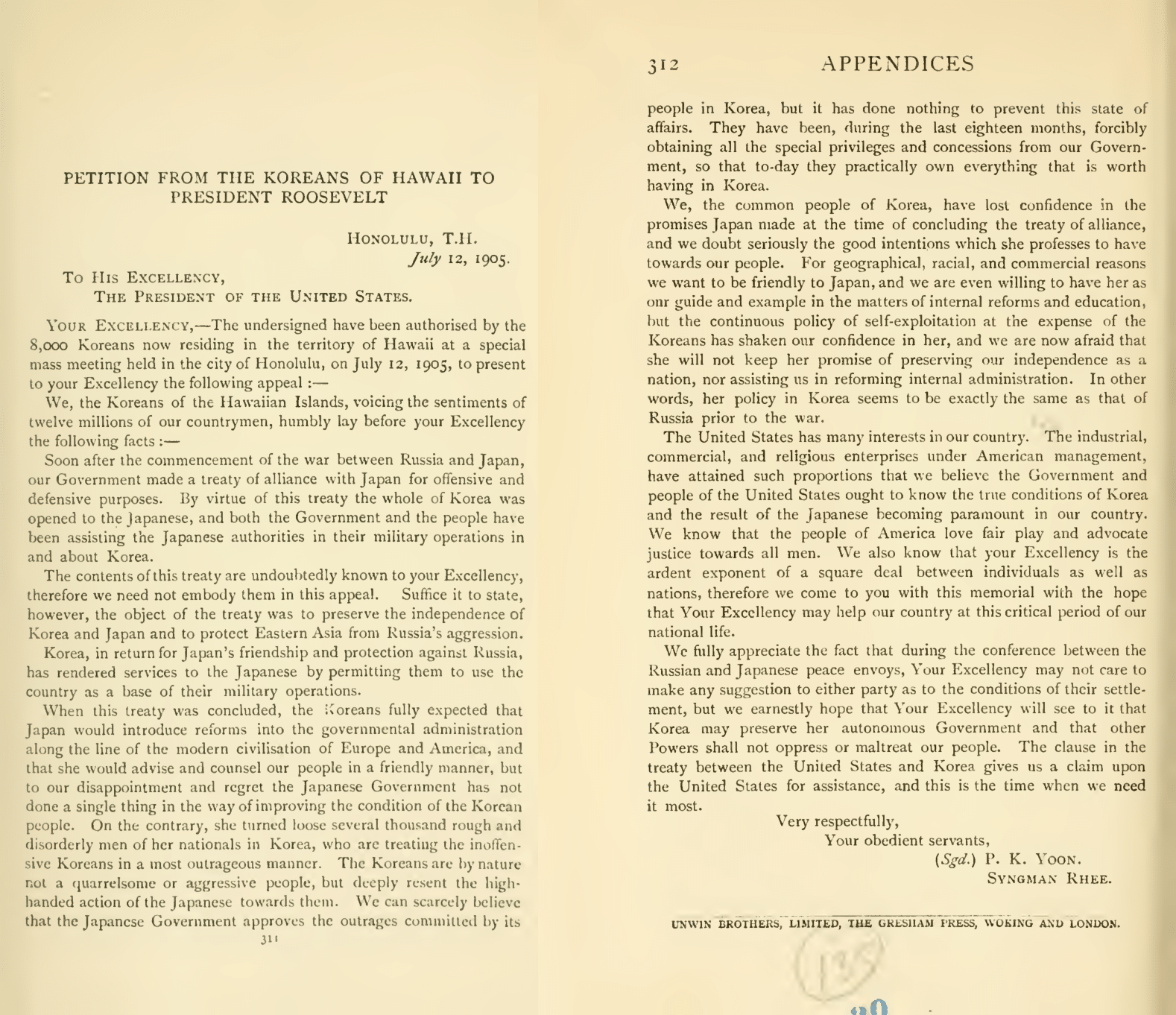 당시 미국 국방장관 윌리엄 하워드 태프트는 앨리스 루즈벨트와 그녀의 남편인 하원의원 롱워스와 함께 극동으로 가는 길에 하와이에 잠시 머물고 있었다.[5] 하와이 동포들은 이들을 환영하는 대규모 민중대회를 열었고, 윤병구의 지휘 아래 하와이 군도에 있는 4,000여 명의 한인들의 이름으로 1882년 조미수호조약에 따른 한국 독립의 보호를 루즈벨트 대통령에게 청원하기로 결의하였다.[5]
