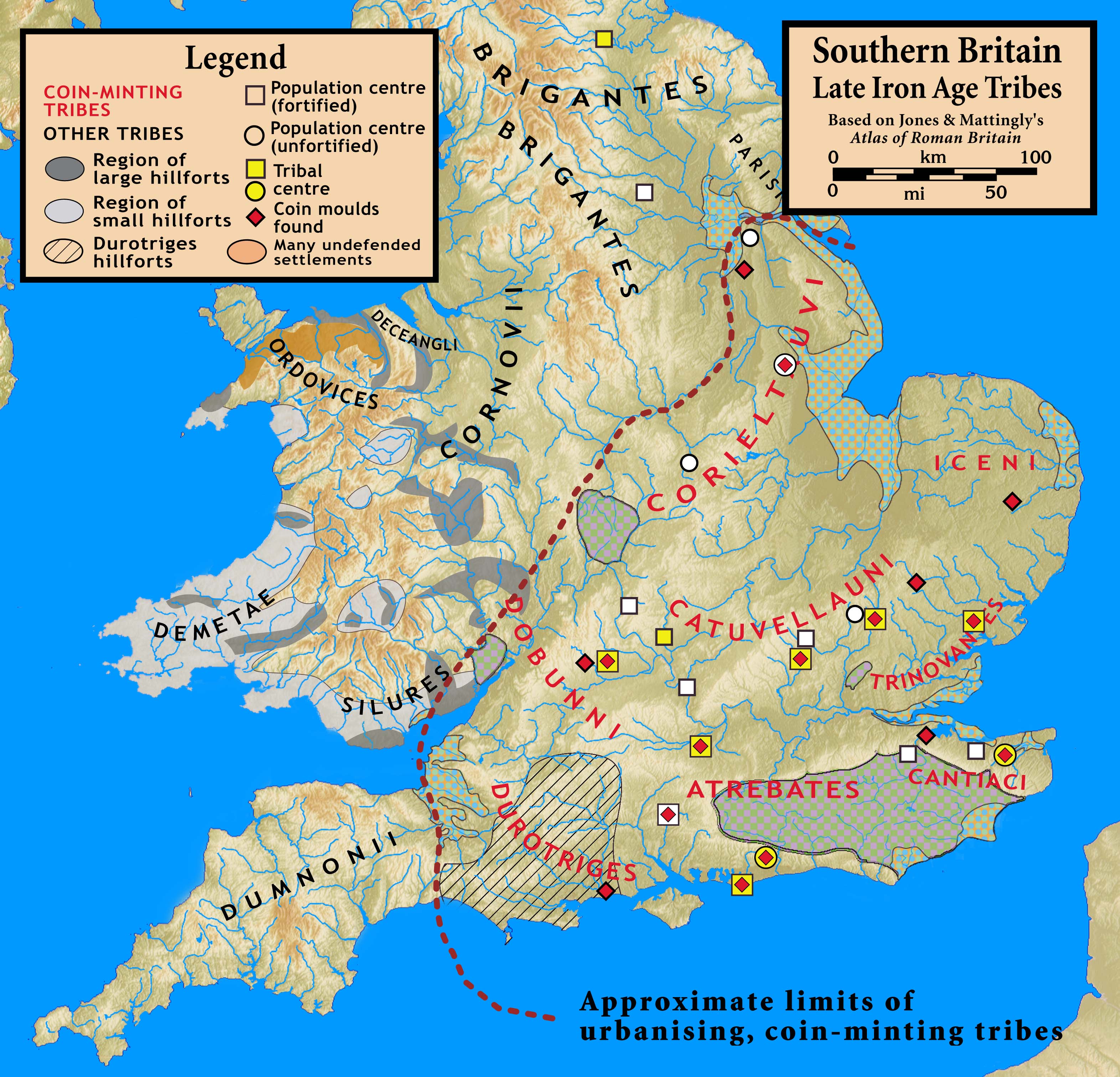 카이사르는 갈리아 북부의 벨가이족이 브리튼에 건너와 정착하고 있으며, 수에시오네스족의 왕이었던 디비키아쿠스가 갈리아와 브리튼에서 영향력을 행사했다고 기록하였다.[118] 당시 브리튼섬에서는 기원전 100년 무렵의 갈리아-벨가이 화폐나 기원전 150년 무렵의 갈리아 화폐 등이 켄트 지방을 중심으로 통용되었다. 후대로 가면 도싯에서 서쪽으로 멀리 떨어진 남부 연안까지 화폐가 사용되었고 이는 벨가이족의 영향력이 커졌음을 의미한다.[119]